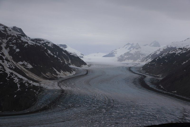 Nous sommes vite sur Stewart et Hyder et nous allons directement au Salmon Glacier, un des plus grands d'Alaska. Nous le découvrons en le surplombant ce qui rajoute à la beauté du lieu, quel dommage ce temps gris, pas bon pour les photos. Nous serons obligés de rentrer plus vite que prévu car nous essuyons des averses et le ciel est complètement plombé.