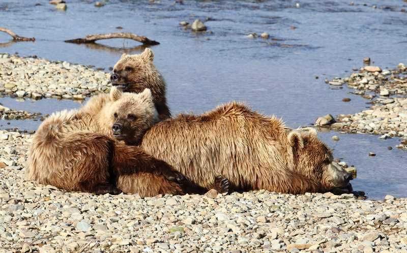 5h30, debout tout le monde, douche, fermeture des sacs, petit déjeuner, chargement du mini bus et nous voici en route vers l'aéroport, comptoir de la Pen Air à 7h00. Tout le matériel nécessaire ainsi que la nourriture représentent un bon nombre de grosses glacières, les sacs de chacun sont également très lourds avec le matériel photo, ordi et autres moyens permettant de décharger les cartes photos. Le vol est annoncé à 9h25 et il durera 1h30 par un temps correct au départ puis devenant très nuageux au sud d'Homer, nous verrons tout de même de magnifiques glaciers et les volcans de la chaîne, quel spectacle. A 11h00 nous nous posons sur King Salmon avec un temps tout gris mais sans pluie donc du beau temps puis nous sommes véhiculés par le personnel de Katmai Air au siège de la petite compagnie d'hydravions qui va nous conduire jusque Crosswind Lake au nord du parc de Katmai. Nous nous changeons de vêtement et enfilons nos waders car la descente des deux hydravions se fera dans l'eau à l'arrivée et il faudra également les décharger. Au bout de cinquante minutes nous survolons la Moraine Creek et apercevons les ours qui semblent en nombre mais également beaucoup de pêcheur, nous sommes en pleine saison de pêche ici en Alaska. Dès que les deux hydravions sont déchargés nous installons le camp derrière de petits arbustes afin de nous protéger du vent d'est qui est le vent des tempêtes et ici il souffle à 150km/h et il devient impossible de maintenir les tentes montées. Nous irons assez vite pour tout installer et partirons pour une première observation des grizzlis depuis une petite plage, les APN chauffent, les cartes se remplissent vite, nous sommes très heureux d'être de nouveau ici sept ans après notre première visite. Soirée coule et dodo vers 20h00 car tout le monde est fatigué et puis demain sera un autre jour!