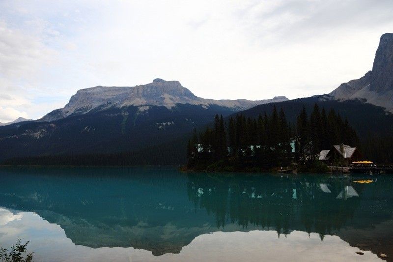 Nous sommes debout à 7h00, pas le temps de flâner, il a l'air de faire beau, en tous les cas il n'y a pas eu d'orages cette nuit. Nous prenons la route en direction de Yoho national Park que nous aimons et qui est pour nous le plus beau parc de l'ouest canadien. Nous faisons un stop au Natural Bridge et sommes surpris de constater qu'il n'est plus permis de le traverser à pied, il y a des barrières et il n'est plus possible de se prendre pour un pionnier traversant les rivières à gué. Ensuite direction le Lake Emerald, un de ces beaux lacs aux couleurs turquoises et où il y a un superbe lodge. Nous ferons le tour du lac en 1h00 (6km) mais malheureusement le temps est très voilé et il risque de pleuvoir d'ici peu. De retour dans Hugo nous essayons de voir ce que sera le restant de notre journée, nous faisons un stop au "visitor center", prenons quelques renseignements sur les campings ouverts et surtout nous demandons pour réserver un bus qui nous mènera au Lac O'Hara en 13km. La route est fermée à toutes circulations autres que les pompiers et le bus des rangers de Field. Pas de place disponible avant la fin de l'année, nous sommes effarés car nous étions venus une semaine au lodge en 1994 et il suffisait de réserver le bus pour le lendemain, les temps changent. Et bien nous irons au Lake O'Hara à pied par le sentier et nous pourrons redescendre par le bus, ce qui sera toujours mieux que ne pas y aller, un pèlerinage pour nous dans cet endroit à la beauté sans égale.
