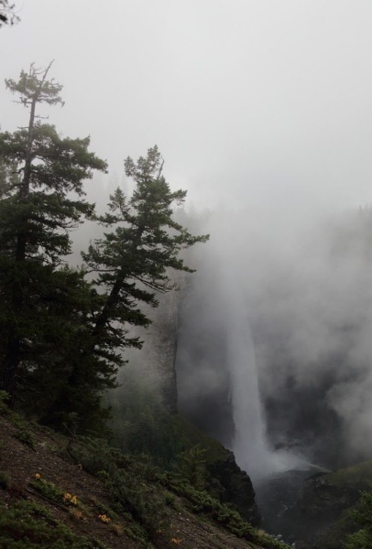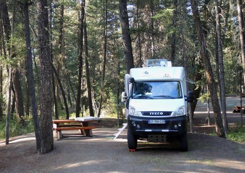 De l'orage cette nuit, pas étonnant après les 29° d'hier soir, nous avons eu chaud, tant mieux. Ce matin nous sommes dans le brouillard et nous partons vers 9h00, nous décidons de revoir une des chutes d'hier qui était face au soleil mais ce matin elle est dans les nuages, grrr. Nous faisons un stop sur une autre chute que nous n'avions pas faite hier, celle ci est dégagée et ressemble à la "Piscia di gallu" en Corse, elle sort d'un trou et se jette d'un seul saut dans le canyon. Nous continuons maintenant notre route en direction des parcs de l'ouest où nous devrions être demain en début d'après midi, les distances sont telles que nous préférons faire de petites journées avec un maximum de 400km. Nous passons Revelstoke et nous remontons la vallée vers Glaciers national Park où nous espérons pouvoir trouver un campground pour la nuit. La saison touchant à sa fin, beaucoup de parcs ferment leurs campings, cela va commencer à être galère pour nous.