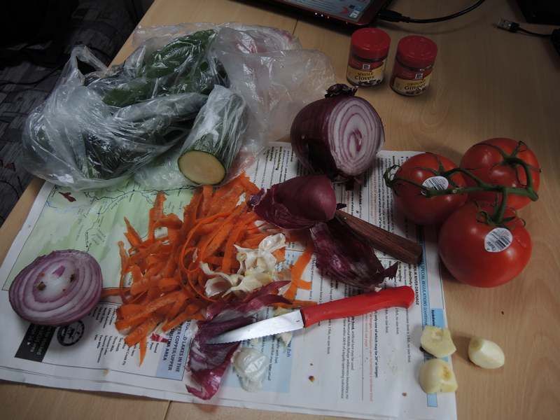 Nous passons la soirée à bricoler pour moi et à cuisiner pour Françoise, ce soir c'est pâtes à l'ail, courgettes, tomates, un régal pour moi.