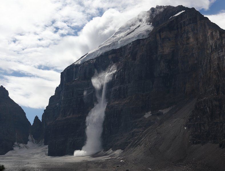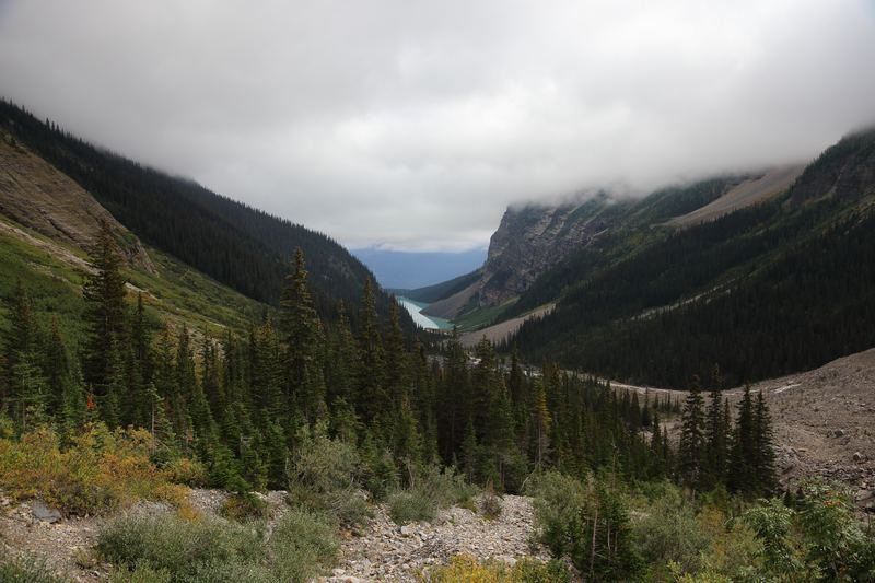 Une nuit sans pluie, autrement dit nous avons bien dormi car la pluie sur la cellule fait beaucoup de bruit, enfin cela est valable pour tous les camping car. Ce matin malgré tout le ciel est plombé, les nuages ne sont pas loin et comme le beau temps est attendu pour demain, ne soyons pas pressés. Nous partons tout de même en balade et nous allons nous faire la randonnée de "Plain of the six glaciers" avec un retour par le Lake Agnés soit une promenade d'environ 14km. Le sentier part du bord du Lake Louise au pied de l'hôtel "HLM" vraiment affreux et qui n'a rien à faire dans un tel lieu, mais bon il est là faisons avec. A 10h30 le parking est saturé, incroyable le monde qu'il y a encore, nous prenons le sentier, dépassons un maximum de personnes qui se baladent au bord du lac puis nous grimpons vers les "six glaciers". Le temps semble s'améliorer, des trouées de ciel bleu apparaissent, mais c'est très furtif. Nous atteignons le but de notre balade, faisons un pique-nique rapide et redescendons sous les gouttes en passant par un autre sentier qui va nous conduire au Lake Agnes. Nous assistons à la chute d’un énorme sérac depuis le glacier du Mont Lefroy, impressionnant. Toute cette partie se fait sans presque personne mais nous allons vite retrouver la foule après le lac et ensuite les rives sont bondées et devant le HLM c'est de la folie, vite tirons nous d'ici et rejoignons notre campground où là nous serons au calme. La pluie ne nous quitte pas, nous sommes septique quant au soleil pour demain, bon restons optimistes, nous verrons demain et demain sera un autre jour.