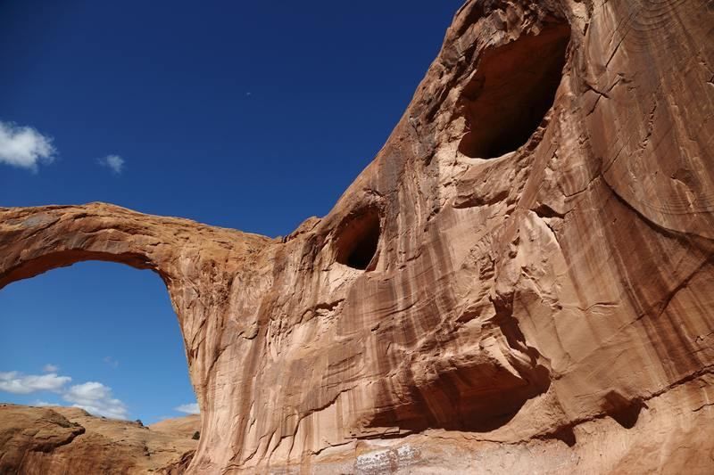 Une année de plus pour nous deux, c'est notre anniversaire ce jour et nous allons fêter cela par une belle balade qui va nous mener, par un beau canyon, au pied d'une magnifique arche appelée Morning Glory Natural Bridge, 172 mètres de long, vraiment très beau. Nous prenons le sentier vers neuf heures et longeons le petit ruisseau très clair avec de nombreux alevins et poissons d'eau douce. Nous allons le traverser de nombreuses fois et poursuivre notre route jusque sous le bridge. Je vais pouvoir photographier des varappeurs qui descendent en rappel la paroi à proximité, l'envie est grande de les imiter surtout quand je vois ces merveilleuses parois qui nous entourent. Nous retournons au parking que nous atteindrons à onze heures trente, soit une heure et demi de moins que le temps donné sur le panneau au départ du sentier, nous commençons à retrouver la forme.