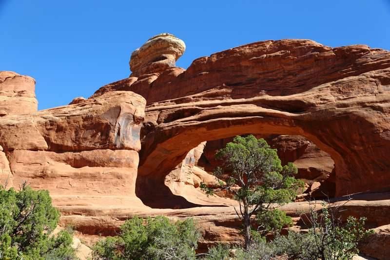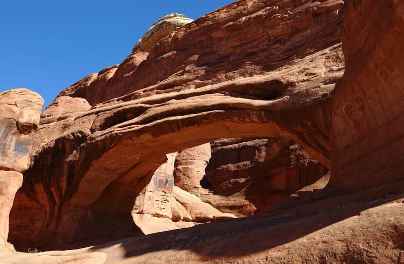 Nous arrivons au campground, une pancarte annonce "full", nous entrons tout de même et allons jusqu'au bout, les "host" sont sur leur petite voiture électrique, ils font le tour, nous voyons un poteau sans écriteau, nous entrons sur le site et Françoise va voir les "host" qui lui dise que la place est libre pour deux nuits mais qu'elle est louée pour les jours après, chouette, nous prenons les deux nuits, quelle chance car c'est la seule de libre. Une fois payé nous repartons vers notre balade du jour à savoir prendre la Salt Valley et aller jusque Klondike Bluffs puis marcher jusque Tower Arch distante de six kilomètres A/R depuis le parking. La piste qui n'est pas difficile par temps sec est tout de même pénible car elle est entièrement en "tôle ondulée" et ça je n'aime pas du tout. Le départ du sentier est très raide mais nous avons la vue sur les Klondike Bluffs et c'est très beau. Nous arrivons vite sur un col et de là descente presque en courant avant de nous trouver sur une dune de sable qu'il va falloir monter, là c'est pénible mais cela ne dure pas trop longtemps. Encore quelques centaines de mètres et nous voici au pied de l'arche, magnifique dans le soleil, il y a un autre couple qui fait des photos. nous allons rester là une bonne demi-heure et faire le chemin inverse qui va nous reconduire au parking un peu avant treize heures. Il fait très chaud surtout pour marcher, nous retournons nous poser au campground et en soirée nous partirons faire deux autres arches toujours à pied pour profiter du coucher de soleil, quelle belle journée.