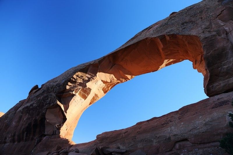 Nous repartons vers 17h30 depuis le campground et nous prenons un sentier superbe qui va nous conduire sur une série d'arches et surtout sur de magnifiques paysages au soleil couchant. Nous serons de retour vers 18h45, fatigués, il est temps que la journée se termine, nous dînons dehors et profitons du spectacle donné par le soleil.