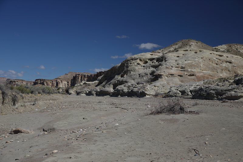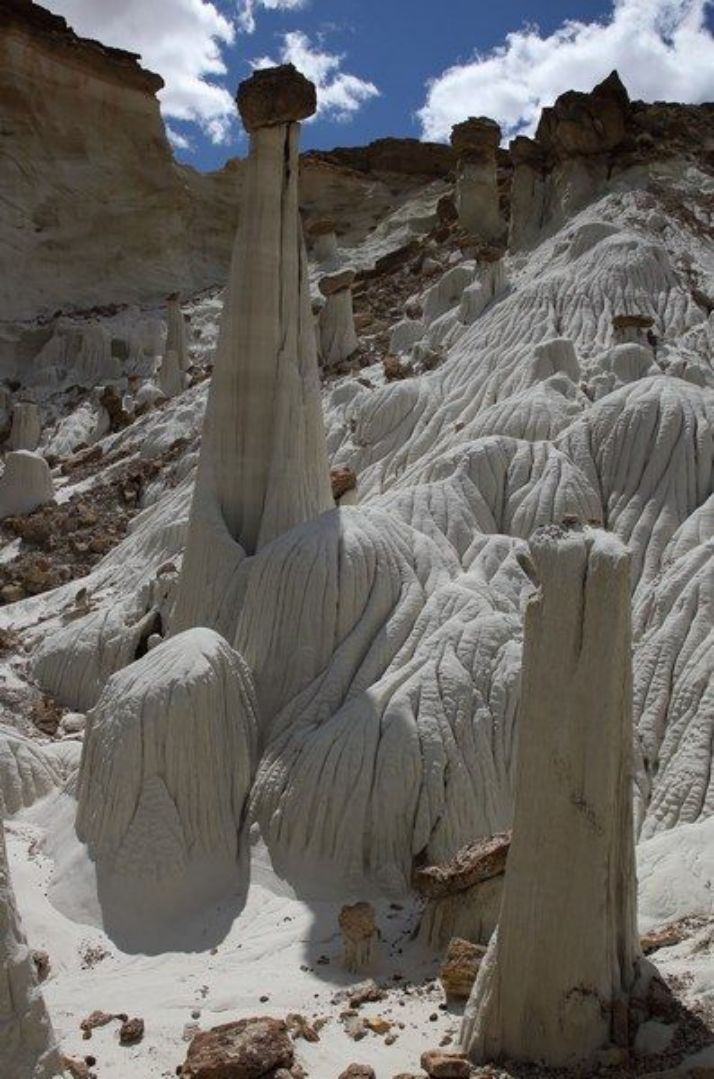 A Big Water nous cherchons et finissons par trouver la BLM 327 qui part juste en face du Visitor Center, la suivons pendant quelques miles et franchissons le wash dans lequel il y a un peu d'eau. Nous laissons nos camions sur le parking et commençons la remontée du wash dont l'humidité ramollie le sable et par endroit nous nous enfonçons. La marche va durer 1h30 et nous sommes au premier groupe de hoodoos, seuls bien évidemment car il semblerait que l'éloignement de ce site en rebute plus d'un. Nous apprécions d'autant et allons marcher deux bonnes heures parmi ces trois groupes de hoodoos dont le plus beau est le dernier. Après une centaine de photos, nous reprenons le chemin inverse pour une arrivée aux camions à 16h00 et après cinq heures de marche sous le soleil, nous sommes très satisfaits de cette belle balade et rentrons au bivouac du soir à la Marina. Nous prenons une bonne douche au bureau d'accueil du camping, un petit peu d'internet pour vérifier les messages et nous nous installons pour la nuit après un bon apéritif pris en commun chez Sylvie et Christian.