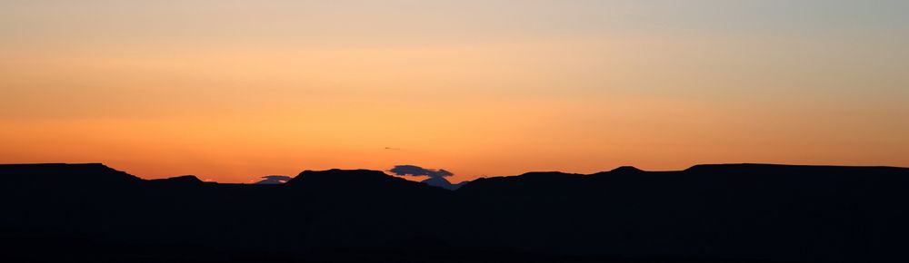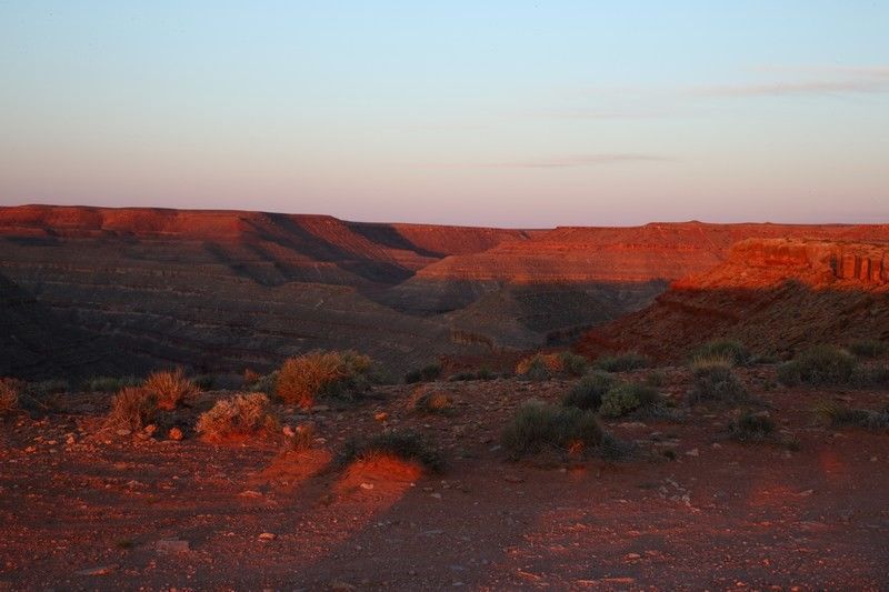 Quel beau lever de soleil nous avons ce matin, c'est l'avantage d'être en altitude avec un horizon dégagé. Nous ne nous lassons pas de ces beaux débuts de journée et je suis vite à faire quelques photos pour profiter des couleurs qui ne vont pas durer longtemps. Le soleil monte très vite et nous voyons les formes décliner en même temps. Au loin les mesas de Monument Valley se colorent elles aussi, puis cinq minutes plus tard c'est terminé, il faudra attendre ce soir pour trouver de nouveau ces couleurs de feu.