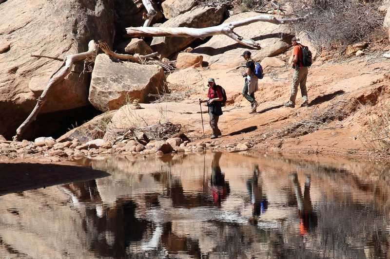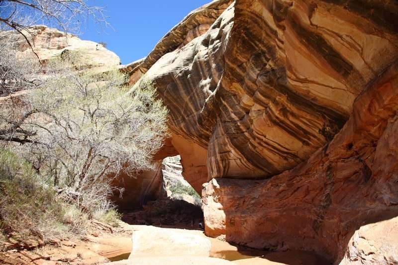 4° ce matin mais un ciel d'un bleu rarement vu pour nous, ceci nous annonce une très belle journée. A 9h00 nous sommes prêts à partir au départ de la balade du jour et cinq minutes plus tard nous attaquons la descente vers le premier bridge qui se nomme Sipapu et qui est le second plus grand après le Rainbow Bridge sur le Lake Powell. La descente fait 1.100km et il y a quelques échelles de bois à passer mais le tout dans une grande sécurité. Il y a un peu d'eau dans le wash mais les arbres n'ont pas encore ouvert leurs bourgeons et cela manque un peu de verdure.