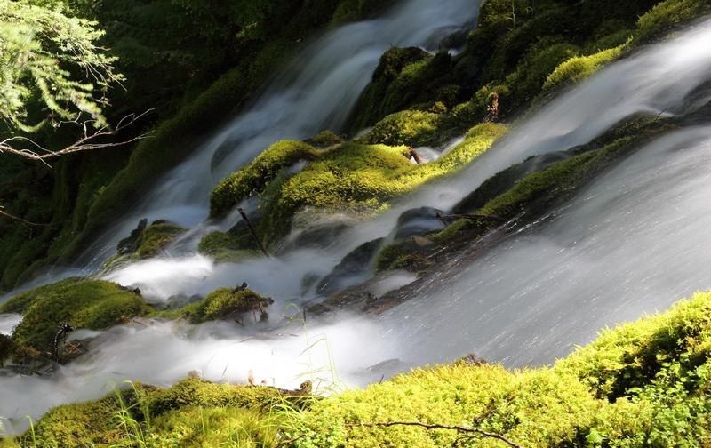 Nous partons pour une belle balade aux "Proxy Falls", le sentier passe dans des coulées de lave et nous mène rapidement devant un merveilleux spectacle. Nous aimons voir couler l'eau et surtout pour toute la sérénité que cela dégage et en plus quand nous avons le privilège de voir de telles chutes nous sommes ravis. Ce va être également pour moi un grand plaisir photographique et ce matin j'emmène le matériel (pied, Wimberley et déclencheur souple) car je vais faire du "filé" et donc il ne faut pas bouger. Nous avons aussi la chance d'être assez tôt au pied des chutes et d'y être seuls, je peux choisir les meilleurs angles de tir et grimper le long de la cascade sans être ennuyé. Nous mettrons deux heures trente depuis le campground pour en faire l'aller et le retour et nous rentrons pour déjeuner, il est 13h00. Nous nous installons au même site qu'hier soir et resterons là pour la nuit prochaine. Après-midi à regarder les photos, en faire le tri et mettre le site à jour. Françoise travaille sur son album photo, cela commence à bien avancer, elle a de la matière à utiliser!