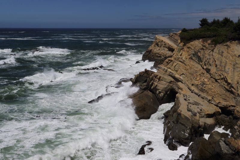 6h00, il commence à pleuvoir assez fortement et ça et bien ce n'était pas prévu, il devait faire grand beau ce jour. Nous nous préparons et allons aller faire les courses car il nous faut du ravitaillement, cela va laisser le temps au soleil de revenir. Nous trouvons un MacDo et en profitons pour aller sur nos messageries et ensuite, pendant que Françoise va parcourir les allées du supermarché, j'en profite pour me faire couper les cheveux qui en ont bien besoin car je n'ai pas vu de coiffeur depuis le 26 avril à Montréal, presque trois mois! Nous déjeunons sur un parking face à l'océan et sous un soleil éclatant, le temps change vite ici, il y a du bleu partout. Après le déjeuner nous partons faire une belle balade à pied toujours le long de l'océan et admirons les grosse vagues qui viennent se fracasser sur les rochers, cela remue plus qu'hier. Nous allons marcher de nouveau presque trois heures et c'est encore fourbus que nous rentrons chercher Hugo et rejoignons notre emplacement au campground. Nous sommes accueillis par un couple de Californien (Yvonne et MarK), Yvonne parle parfaitement le français et sans accent, nous échangeons un bon moment avec eux avant de continuer de nous installer pour la soirée. Nous sommes toujours au soleil et ce soir je place Hugo de façon à avoir la lumière dans la porte, il fait bon. Soirée tranquille, tri des photos et MAJ du site, ce soir nous dégustons du crabe de l'Oregon, humm!