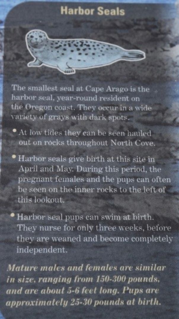 Et bien nous sommes sous la pluie depuis 3h00 ce matin et cela dure mais c'était prévu et il devrait faire beau demain, si si c'est la météo qui le dit. Nous ne faisons que 10km pour nous rendre dans un autre "State Park" au "Cape Arago" et nous nous installons au campground de "Sunset Bay" du fait que nous ne roulons pas beaucoup depuis quelques jours et vu le peu d'ensoleillement que nous avons nous nous branchons électriquement. Il y a de nombreux sentiers à faire ici et nous allons y aller cet après-midi dès que le temps sera redevenu plus sec. La baie est colonisée par les "Sea Lion" et autres otaries et éléphants de mer ainsi que par une grosse colonie d'oiseaux, guillemots, hérons et d'autres à découvrir.