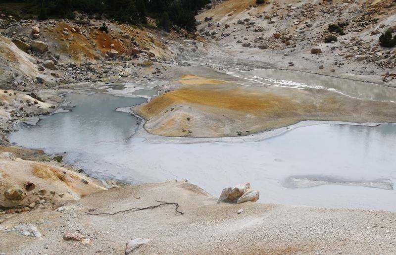 La nuit fût longue et pas terrible mais ce matin le soleil est là, enfin disons qu'il ne pleut pas et qu'il fait moins sombre. Nous quittons le lac vers 9h30 et entamons la montée qui va nous conduire au pied du "Mount Lassen", le plus haut volcan de la région. Nous laissons Hugo sur un parking et partons faire une balade de deux heures, nous allons voir des "fumerolles", une zone de hautes températures avec des geysers. Il y a quelques rayons de soleil mais ils sont bien pales, le principal c'est que nous puissions en profiter. Cette balade nous fait du bien, en chemin nous croisons des français mais pas d'échange avec eux, nous supposons que comme nous ils ont du être surpris d'entendre leur langue dans ce parc qui n'est pas un grand centre touristique pour les européens.