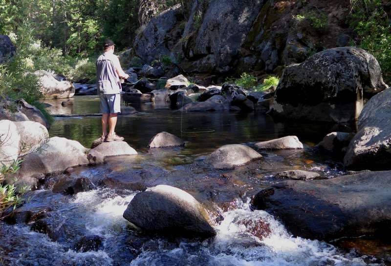 Nous nous installons dehors pour le déjeuner, il fait chaud mais c'est largement supportable et nous sommes à l'ombre des grands sequoias. Vers 15h00 je prépare mon matériel et je pars au bord du torrent, j'y découvre des endroits vraiment très beaux avec des cascades, certainement le plus beau pour moi tant en esthétique que pour la pêche. Je ne rentre que vers 19h15, c'est peu dire que cette après midi fût très bonne pour moi. Je relâche beaucoup de truites, n'en conservant qu'une seule, nous verrons demain pour en conserver un peu plus pour le dîner, c'est tellement agréable de relâcher tout ce poisson, un vrai plaisir.