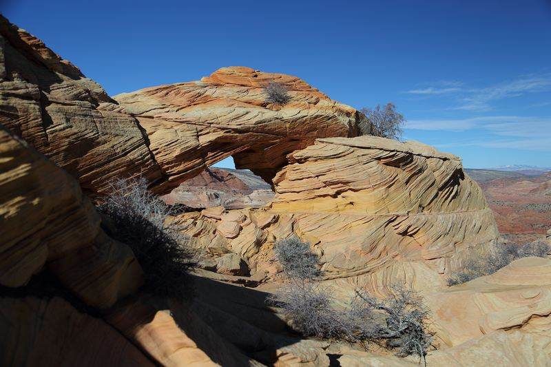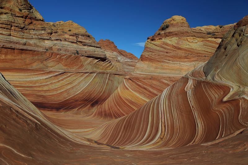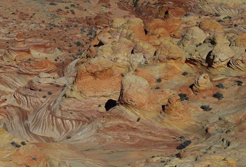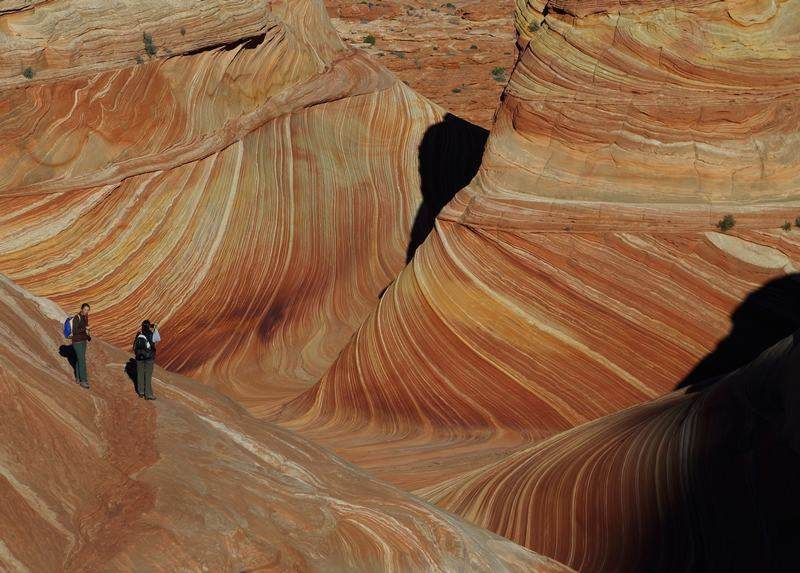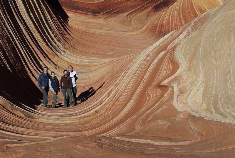 Le soleil tarde à venir pour éclairer "The Wave", nous attendons bien sagement qu'il se montre, il y a un autre randonneur qui lui a été tiré sur la loterie internet, trois mois avant. Des vingt personnes qui devraient être là, seules onze seront présentes. Là ce n'est pas normal car les absents prennent la place de ceux qui seraient bien venus. Par contre nous ne sommes pas enquiquinés pour faire nos photos. Nous allons parcourir les lieux pendant quatre heures et faire des découvertes sur le haut de "The Wave" avec Christian, en allant sous une arche et en direction d'autres arches et de dunes de sable. Nous retrouvons Sylvie et Françoise après avoir redescendu en désescalade ces rochers bien pentus. Maintenant il faut songer au retour avant la nuit car il est 14h00 et nous devons être rentrés avant 16h00. Il fait chaud sur le parcours du retour, c'est très agréable et nous ne mettrons que une heure trente en marchant tranquillement dans ces lieux magnifiques. Nous apprécions le retour dans Hugo et au campground, une bonne douche, un regard rapide sur les photos et la soirée sera vite passée. Nous sommes fatigués et ivres de ces images qui défilent devant nos yeux, de beaux rêves pour cette nuit.
