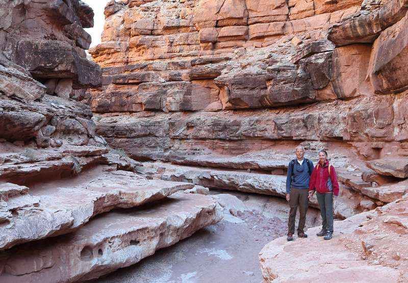 Ce matin nous allons dans "Cathedral Wash", un canyon qui descend du Vermillon Cleef et qui va rejoindre le Colorado dans le "Grand Canyon". La balade commence tranquillement et ne présente pas vraiment d'intérêt au départ mais très vite nous allons avoir un aperçu de ce qui va nous attendre tout du long. Un passage en désescalade avec de l'eau pour nous recevoir en cas de glissade, nous oblige à passer avec de grandes précautions, mais tout va bien. Nous allons continuer cette descente pendant 1h30 avec beaucoup d'attention tout du long car il y a quelques pas d'escalades à faire et il faut venir en aide aux femmes qui ne sont pas toujours à l'aise sur ce genre de terrain. Le soleil ne pénètre pas dans le canyon ce qui fait que nous serons dans l'ombre tout du long, il est trop bas en cette période pour nous éclairer. Nous atteignons le Colorado et retrouvons un peu de chaleur, une halte casse-croûte et un peu de repos nous ferons le plus grand bien. Il y a énormément de truites à cette endroit et le pêcheur que je suis rêve de lancer la mouche, je me contente de les regarder. Le retour sera tout aussi passionnant et difficile pour nos moitiés, il ne nous faudra malgré tout que 1h30 pour retrouver Hugo. Il est 14h00 quand nous commençons à déjeuner et profitons d'une douce chaleur au soleil. Après-midi repos et soirée également, demain nous descendons vers le sud pour être sur Flagstaff lundi 1er décembre.