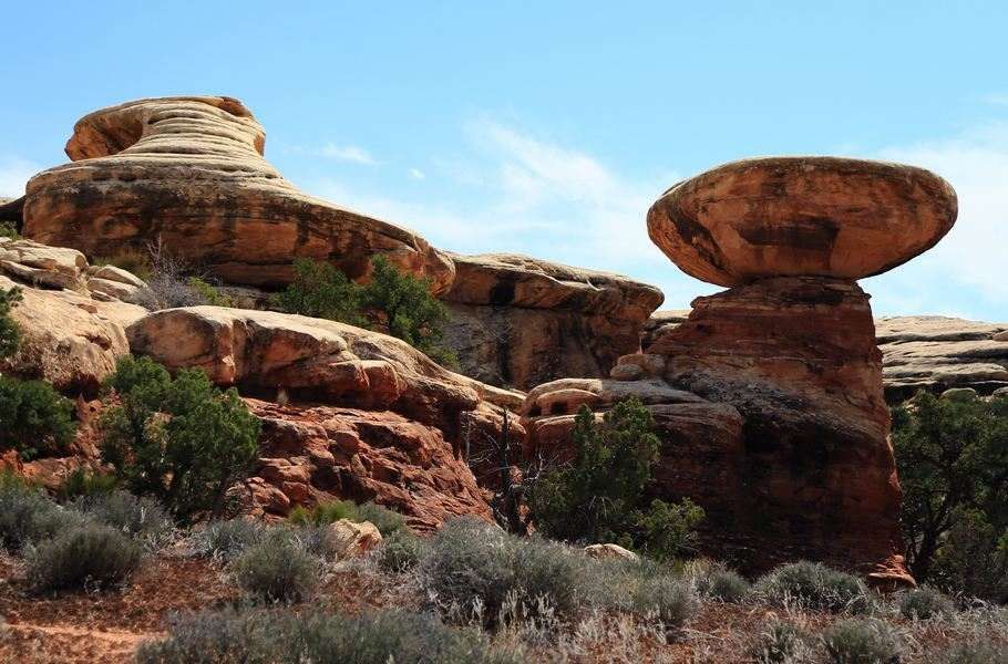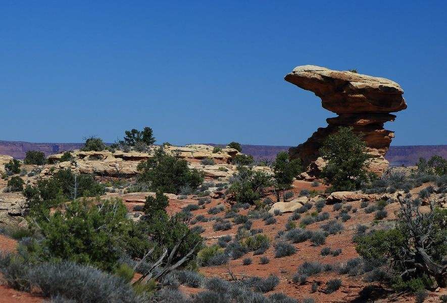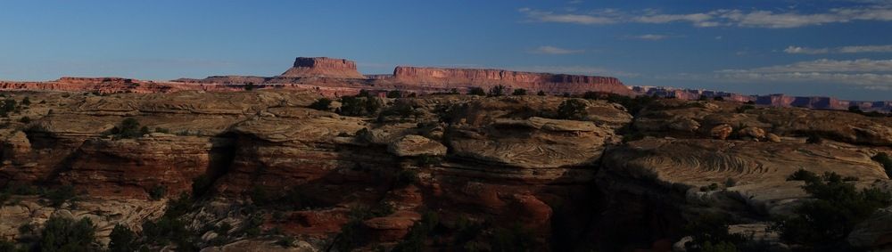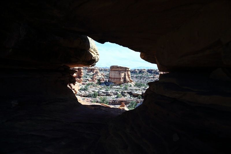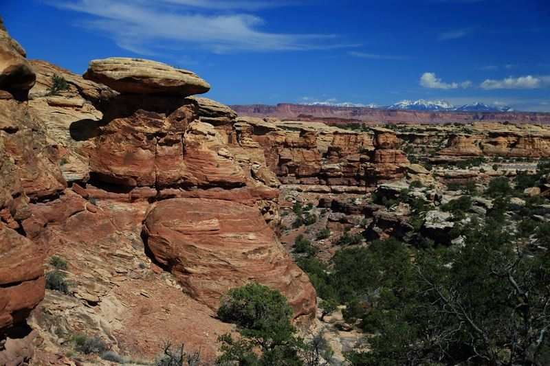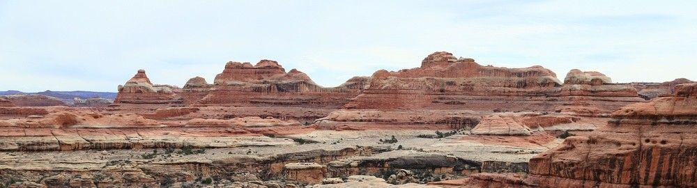 Ce n'est pas le grand beau ce matin mais c'est mieux qu'hier aussi nous nous préparons en vu de notre grande randonnée. Nous quittons notre emplacement pour nous rendre au point de départ du trail sur la piste de Elephant Hill et malheureusement nous constatons qu'elle est fermée. Déception, nous décidons de partir faire une autre longue randonnée de 16km "Confluence Overlook" qui nous permettra de voir le Colorado et la Greene River. Nous sommes au départ du trail à 8h45 et commençons cette difficile balade non seulement elle est longue mais en plus elle ne fait que monter et descendre. Il fait frais dans les canyons que nous traversons et sur le plateau mais quelle belle vue nous avons sur le "Chesler Park" et les Needles. Nous arrivons au point de vue à 11h30 et redescendons nous mettre à l'abri du vent pour manger un peu. Le retour sera plus difficile car non seulement la fatigue commence à se faire sentir mais les passages en escalade sont nombreux et ma petite femme n'aime pas trop, je l'aide bien évidemment à surmonter ces difficultés. Finalement nous serons de retour au pied d'Hugo à 14h45 soit six heures pour faire les 16km/AR, pas mal pour des vieux!