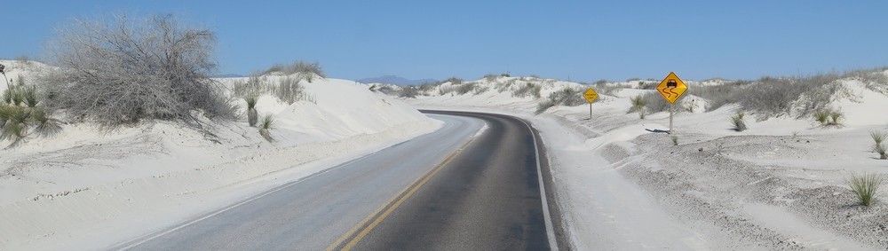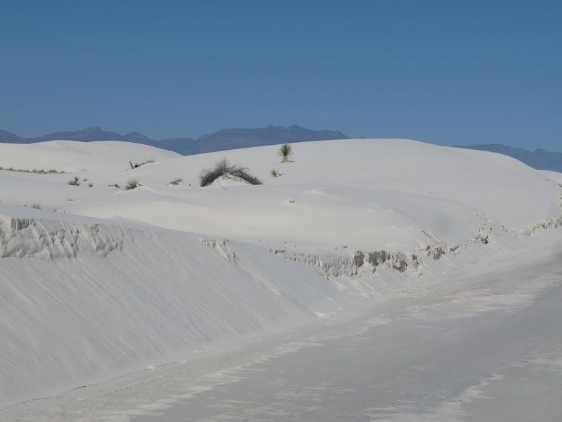 Le soleil chauffe vite ce matin, nous nous préparons et prenons la route vers 8h30 en direction de White Sand National Monument. Nous y arrivons vers 11h00, la plus mauvaise heure pour les photos, la soirée serait bien meilleure. Nous allons jusqu'au bout de la route et laissons Hugo sur un parking puis nous empruntons un sentier, en fait nous suivons des traces dans ce gypse tout blanc. On pourrait croire à de la neige mais ce gypse vient des montagnes environnantes et recouvre 715km carrés de désert ce qui représente la plus grande dune de gypse au monde. La pluie et la neige qui tombent sur les montagnes vont dissoudre le gypse, le séparer des pierres et le déposer dans le bassin de Tularosa.
