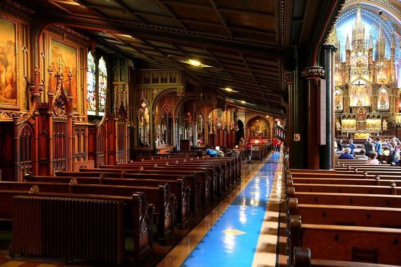 Le métro passe sous le St Laurent et dessert l'Ile Ste Hélène (Parc Jean-Drapeau) puis arrive rapidement à Berri-UQAM, nous pouvons commencer notre visite. Finalement c'est aussi rapide que la visite de Québec, nous allons marcher quatre heures sous le cagnard et cette humidité ambiante qui n'est pas sans nous rappeler la Malaisie, il fait vraiment mauvais. Nous déjeunerons dans un restaurant qui semblait sympa de l'extérieur mais qui ne nous laissera pas un grand souvenir. Nous arpentons le vieux port, le vieux centre, puis nous entrons dans la cathédrale Notre Dame. Que l'on soit croyant ou pas, il faut y entrer pour voir le travail qui a été réalisé par les artisans et autres artistes de l'époque, c'est vraiment très beau. La construction à débuté en 1824 pour se terminer en 1880. L'intérieur est inspiré de la Ste Chapelle de Paris.