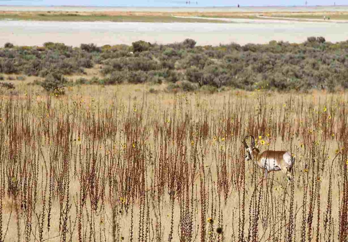 Superbe lever de soleil, le vent qui a été incroyablement fort toute la nuit s'est semble t-il calmé. Petit déjeuner rapide et nous voici parti pour une belle balade de trois heures (10km) pour atteindre un col qui nous permettra d'avoir une grande vue sur le Lake Salé. Nous laissons Hugo III sur un parking et prenons le sentier qui va grimper dur jusqu'au col, la vue est vraiment superbe, et le soleil en prime aide à monter sans se poser de question. Un petit lunch au col et nous voici sur le retour, des bisons paissent un peu partout, nous voyons quelques antilopes mais pas de coyote comme en 2013, dommage.
