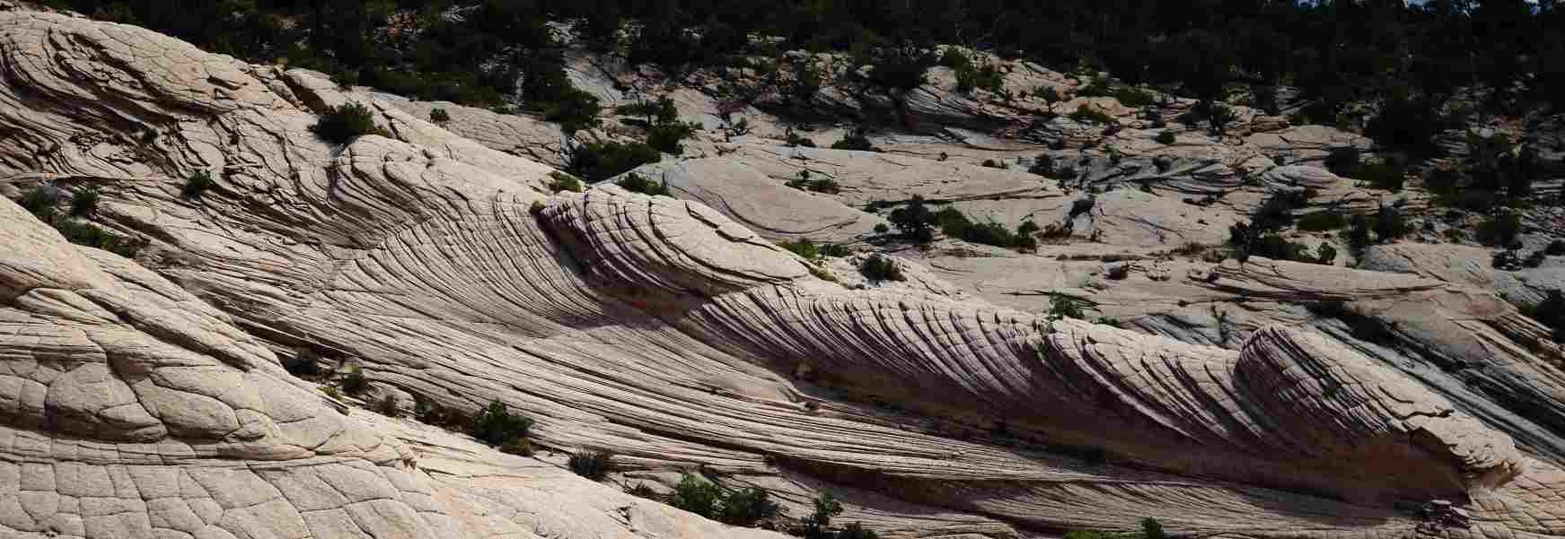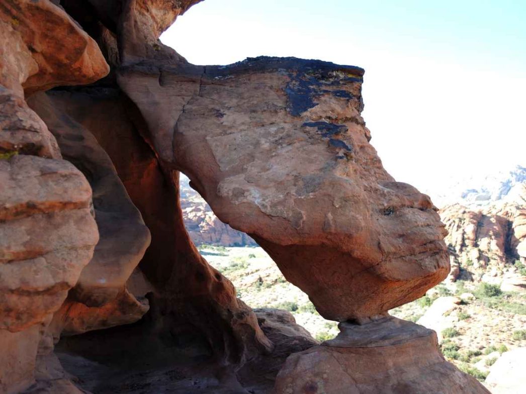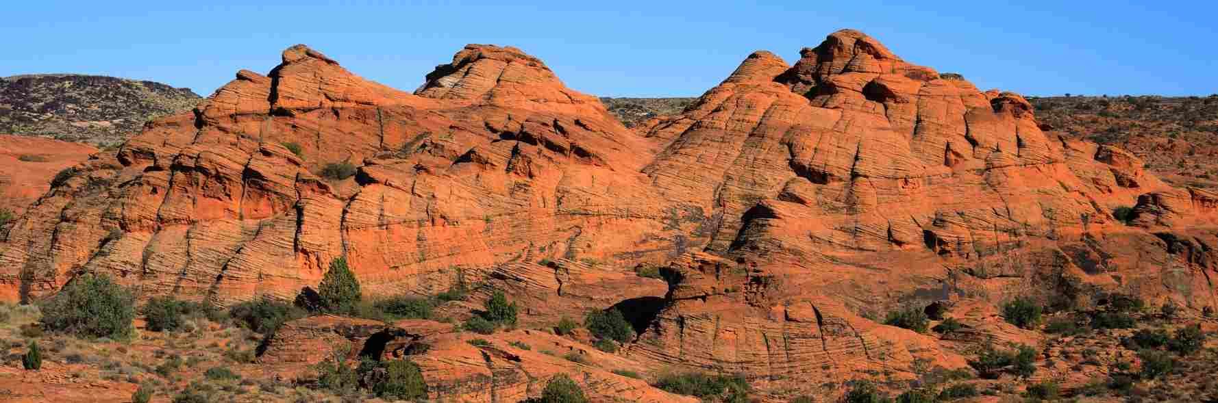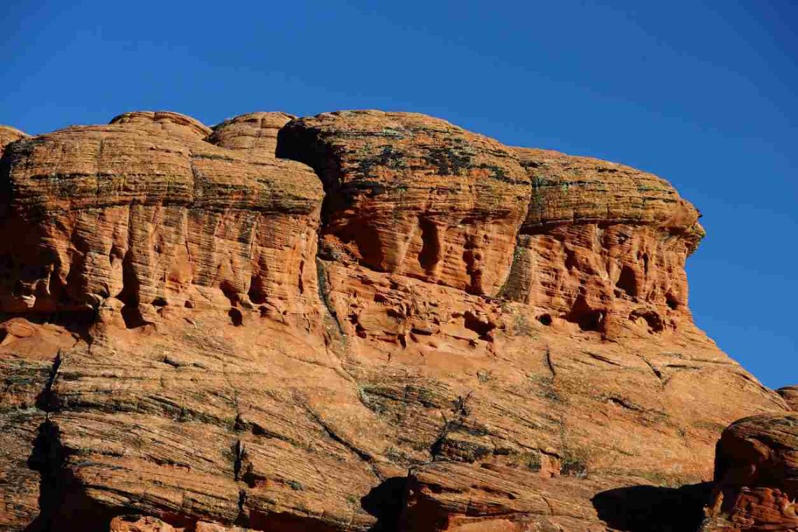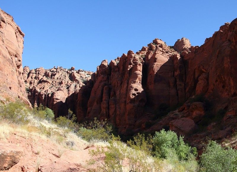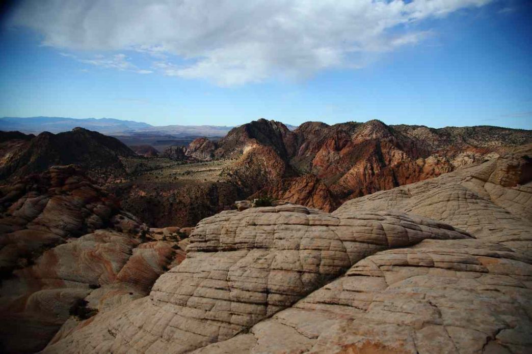 Grand bleu de nouveau ce matin, nous partons vers 9h00 mais faisons un stop au bureau des rangers pour essayer de nous trouver un site pour le W-E. Nous y allons sans espoir car tout est réservé et surprise nous obtenons un site pour deux nuits. Nous partons le cœur léger vers une belle randonnée à Yann Flat. Pour ce faire il va falloir prendre une piste sur 26 km. Elle commence à Leeds au nord de St George et est en parfait état. Elle monte et descend, serpente entre les collines et nous arrivons finalement au parking où rien n'est indiqué, mieux vaut savoir où on va. Cette balade relativement courte monte dans du sable, c'est assez fatiguant pour nos vieux muscles. Nous arrivons au sommet et là , la vue est grandiose sur ces formations toutes en couleurs et ces formes de "brain". Nous allons longer ces dunes pétrifiées et tomber sur un canyon très impressionnant qui plonge de quelques centaines de mètres d'un coup sans prévenir. C'est vraiment très beau. Nous allons rester deux bonnes heures ici, faire le déjeuner et rentrer vers Hugo III sur le coup de 15h00. Au retour nous croiserons plusieurs véhicules qui roulent plus ou moins vite et il faut être vigilant. Fin de journée tranquille au Snow Canyon où il fait encore très chaud.