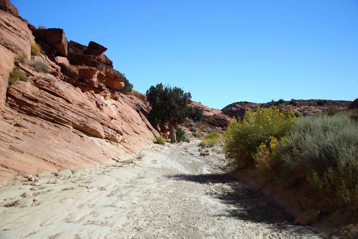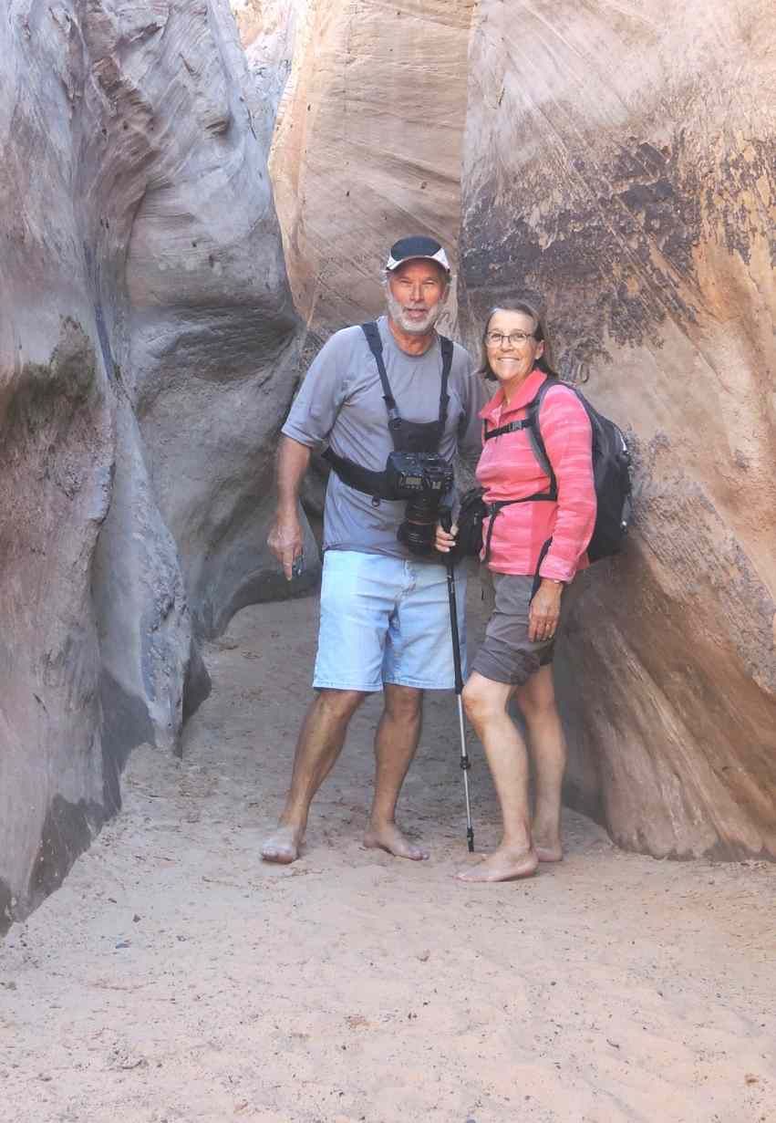 Ce matin nous allons pour la troisième fois en quelques années essayer d'aller dans le Zebra Canyon qui a la mauvaise idée d'être souvent inondé. Nous prenons la HITRR et allons très vite nous poser au parking de départ du trail, il faut aux environs d'une heure et quart pour arriver à l'entrée du slot mais comme nous avançons d'un pas très entraîné depuis deux mois il nous faudra moins d'une heure. Le trail pour y arriver propose en son milieu de traverser des paysages absolument splendides et les photos ne vont pas manquer. Quand nous arrivons à l'entrée du slot un couple en sort et nous dit que l'eau est vraiment très froide et qu'il faut des sandales pour ne pas se faire mal. Ok pour le passage à sec c'est raté mais il y a moins d'eau que quand nous y étions venus aussi nous nous mettons pieds nus et entrons dans l'eau. Waouh quelle surprise, l'eau est absolument glacée, c'est très difficile de supporter , Françoise fait demi tour, je continue mais je n'irai pas très loin car sans sandales impossible de passer les zones rocheuses. Pas grave il faut savoir se contenter des quelques dizaines de mètres dans ce slot et faire demi tour pour ne pas se faire mal aux pieds, ils vont encore servir !