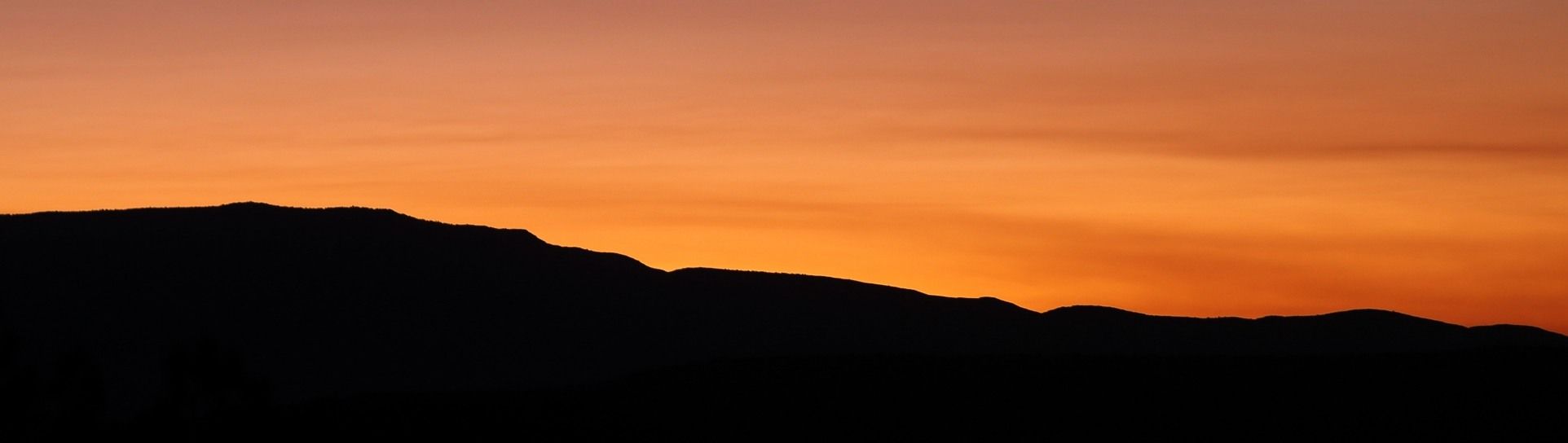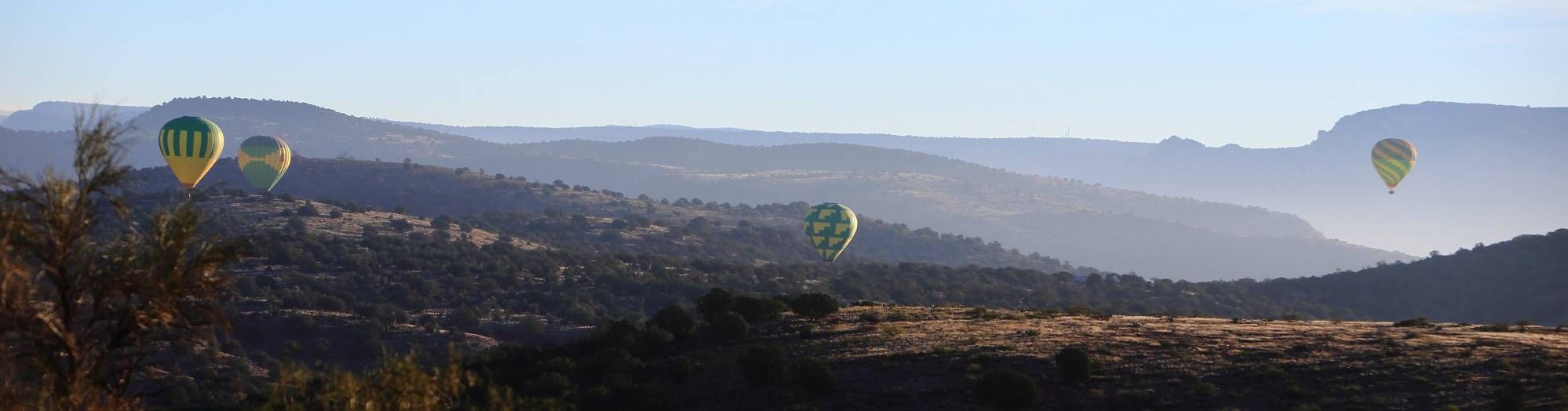 Des ballons dans le ciel au moment ou le soleil monte derrière la montagne.