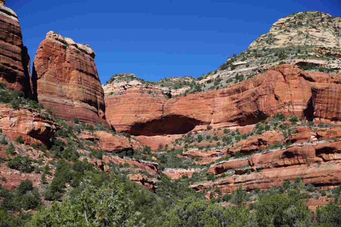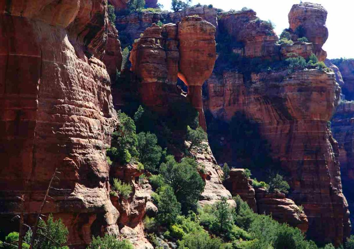 Après une bonne nuit nous sommes debout assez tôt pour voir s'envoler les ballons qui cette fois ci viennent presque vers nous mais ce matin je ne sors pas pour les shooter. Nous sommes vite sur pieds et nous partons vers une randonnée au dessus de Sedona, oui mais c'était sans compter que nous sommes dimanche et le parking de la balade est saturé et il est interdit de se garer ailleurs. Nous sommes entourés par de très grosses propriétés et nous comprenons que les parkings soient interdits. Nous filons donc maintenant vers une seconde balade , le Devil's Bridge et nous constatons que le parking est également saturé ainsi que la route qui y mène, dépités nous allons faire demi tour quand une voiture quitte son emplacement devant nous, ouf nous allons pouvoir rester cette fois ci. Nous partons vers la balade qui emprunte une piste réservée aux gros 4x4 et quand nous voyons l'état nous ne regrettons pas de ne pas nous y être engagés. Il nous faudra juste une heure pour arriver au bridge par un sentier qui monte raide et où il faut mettre les mains pour se hisser. Il y a un monde fou, nous faisons la queue en attendant que les gens qui descendent nous laissent le chemin. Evidemment arrivé au Bridge celui-ci est pris d'assaut et il est difficile de faire des photos sans personne dessus.