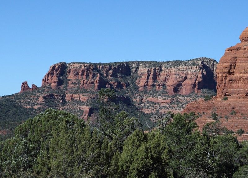 Nous filons vers Sedona de nouveau et cette fois ci nous allons y faire des balades. Celle du jour ne sera pas une très grande balade car il y a du chemin à faire en partant de Flagstaff. Néanmoins nous allons faire le tour et le sommet de Chimney Rock. Nous quittons le parking vers 10h45 et entamons la montée vers la gauche qui nous offre une belle vue sur la vallée et les belles maisons qui sont construites par ici. Nous prenons un sentier assez raide qui part vers le sommet et nous laisse tomber au pied des deux gros cailloux puis il faut redescendre par le même chemin. La suite est plus facile, nous arrivons à Chimney Pass et retour en descente jusqu'au parking où nous retrouvons Hugo III. De là nous partons bivouaquer au même endroit que mercredi et jeudi, nous y sommes au calme et dominons la vallée. il y a quelques véhicules mais ce n'est pas la foule malgré la fin de semaine. Il fait très chaud dehors et nous apprécions l'ombre que nous fournissent les quelques arbres autour de nous.