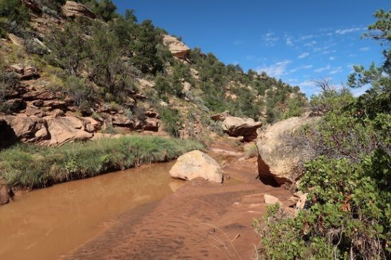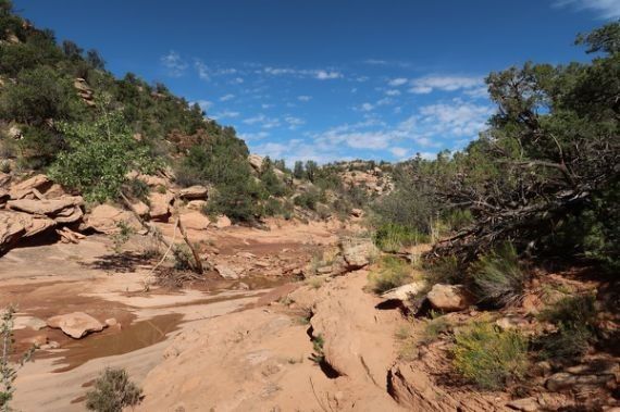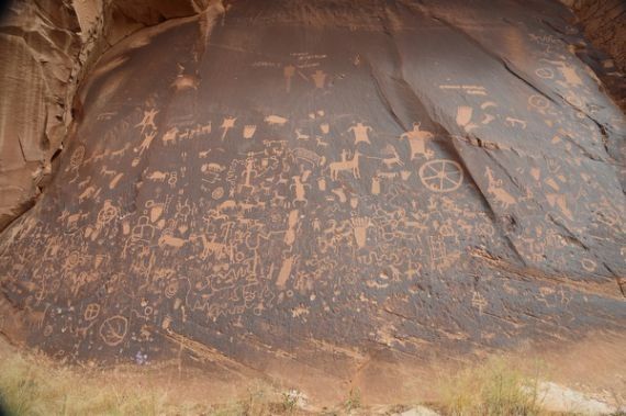 Nous quittons les Bridges car le ciel est menaçant, bon rien de perdu nous les avions déjà fait. Nous prenons la route en direction de Mule Canyon et nous y serons vers 10h00, nous nous préparons pour la rando qui va s'avérer humide suite aux récents orages sur la région. Nous ne mettrons que 30mn pour arriver aux ruines en feu, c'est leur nom. Quelques photos et nous revenons sur nos pas puis nous repartons en direction des Needles pour y retrouver notre bivouac préféré dans la région. Mais avant nous faisons un stop à Blanding pour avoir du réseau afin de faire une réservation aux Falls de Riffel, peine perdue tout est complet jusqu'en octobre ! Nous rejoignons notre bivouac en ayant fait une halte aux Pétroglyphes connus sur la route des Needles, beaucoup de monde ici, la dernière fois nous étions sous la neige et seuls.