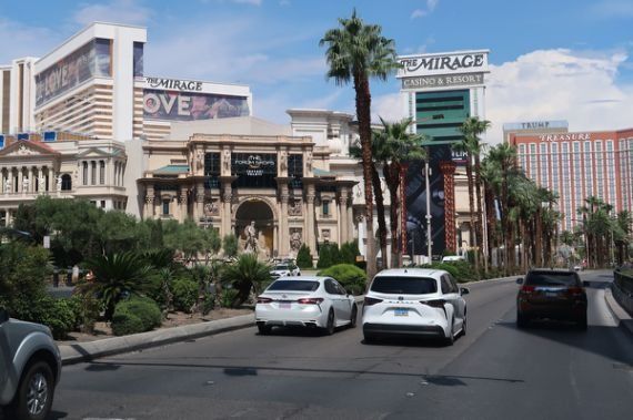 Waouh, quelle nuit avec 37° et ce matin à 7h00 nous avions encore 29°, pas fait pour nous ça ! En plus hier soir un poivrot s'était mis juste derrière la clôture et beuglais à tout va. Obligé d'aller voir le gardien pour lui demander si nous pouvions nous mettre ailleurs étant donné qu'il y avait de la place. Il est venu jusqu'à notre site et a pu constater que nous disions la vérité. Il a baragouiné quelques mots incompréhensibles pour nous aussi j'ai pris la décision d'aller nous mettre plus loin pour être tranquille. Personne n'est venu nous dire quoique ce soit. Nous petit déjeunons dehors et profitons de ces instants avec de l'ombre. Une douche bien mérité va nous redonner quelques forces pour aller faire quelques courses. Ensuite nous traversons Las Vegas en remontant le Strip et sommes très surpris de voir tous les changements depuis 2019. Si nous remontons à notre premier passage ici en 89, c'est complètement une autre ville ! Nous continuons notre route jusqu'au bivouac de ce soir au bord du Lake Mead où en principe nous devrions retrouver des voyageurs, Cathy et Philippe de la région nantaise. 40° cet après midi, bon sang que cela va être difficile pour nous, heureusement qu'il y a du vent au bord du lac, mais pas possible d'aller se baigner, donc du calme et boire beaucoup, cela ira bien.