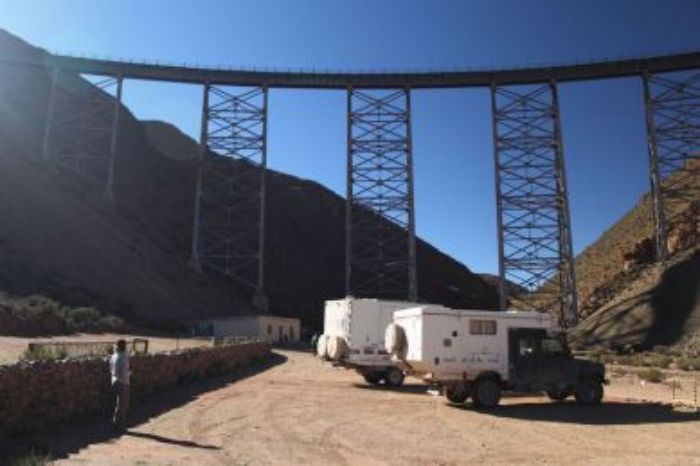 Une longue route nous attend aujourd'hui pour nous rendre sur San Antonio de Los Cobres, à l'ouest de Salta. La piste va nous faire traverser le salar "del Hombre Muerto" en un long contournement vers sa droite. Surprise à la fin du Salar, nous avons un contrôle de police!!!! Sur cette piste où personne ne passe ou presque, que font-ils là? Brève formalité puis nous quittons cette région en traversant à nouveau des paysages de volcans et de nombreux salars. Les paysages deviennent moins intéressants au fil de la journée. Nous passons le col du jour à prés de 4600 mètres puis nous redescendons vers San Antonio. Durant la descente très vertigineuse nous croiserons un poids lourd tirant deux remorques, appels de phares, le camion stop, moi aussi, le chauffeur me parle "no entiendo perfecto" que je lui réponds, il me demande si je comprends le français? A ma grande surprise il est français et travaille ici pour les mines, nous discutons cinq minutes et repartons car nous fermons la piste. Il est tard aussi nous décidons avec Romney d'aller jusque un viaduc où nous pourrons bivouaquer. Nous nous posons vers 17H30 et passerons une très bonne soirée tous les six. Demain nous irons sur Cachi car passer le W-E à Salta ne serait pas idéal.