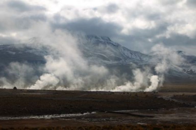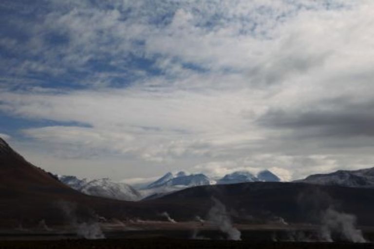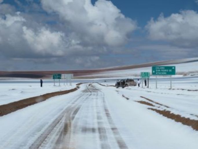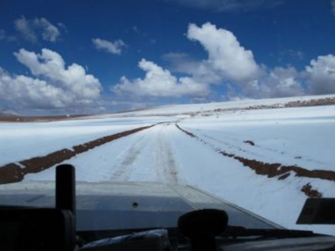 Nos amis partent vers 6H30 pour être au pied de tous ces fumeroles et prendre un bain dans cette eau très chaude malgré le mauvais temps qu'il fait encore aujourd'hui. Pour notre part si nous nous levons tôt également, nous irons nous balader pour admirer le lever de soleil et profiter des quelques rayons qui ne vont pas durer longtemps. Au retour je me changerai pour aller faire un tour sous le châssis d’Hugo et resserrer tout ce qui vibre. Stupeur, un des amortisseurs est cassé et le boulon qui le maintien en place est parti, nous voici revenu quelques temps en arrière quand j'ai eu ce problème dans la descente du Abra del Acay. Au retour des amis, Olivier me trouve un boulon qui devrait faire l'affaire même s'il est court. Après quelques bidouilles, je réussi à le mettre en place et cela maintiendra l'amortisseur sur les 100 Km de piste qui nous restent à faire jusque San Pedro de Atacama. La piste est très belle à la descente mais le mauvais temps nous gâche le plaisir de voir tous ces sommets enneigés qui sont face à nous. Plus nous avançons et plus il fait froid et mauvais, nous trouverons la neige aux alentours de 4500 mètres et un rayon de soleil, c'est très beau même si certains passages sont délicats. Nous arrivons sur SPA vers 15HOO pour faire les courses avant de repartir vers la frontière Bolivienne. Mais pour nous c'est le moment de dire au revoir à nos compagnons, l'état d'Hugo ne nous permet pas de continuer sur les pistes de Bolivie, nous courrons à la panne et là bas ce n'est pas possible de se faire dépanner facilement. Il est donc sage de dire stop même si nous avons une grosse boule qui nous serre la gorge, nous avons passé tellement de très bons moments ensemble, merci à la Romney's Family pour toutes les découvertes de ces pays magnifiques et des bons repas pris ensemble autour de très bonnes bouteilles de vins chilien et argentin. Merci à Olivier et Marie pour leur gentillesse de Vendéens et leur très bonne humeur, nous nous reverrons en France les amis. Bonne route à vous six car il ne faut pas oublier Maxime et Mathéo, deux bouts de choux formidables.