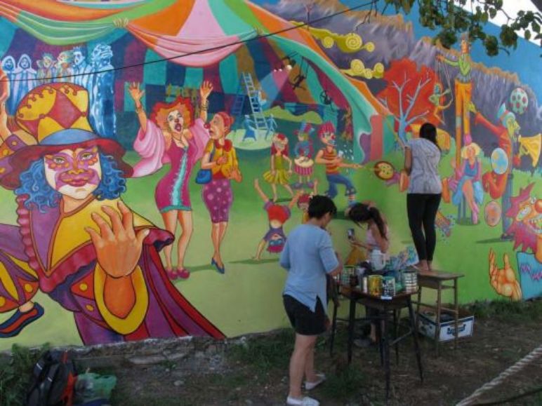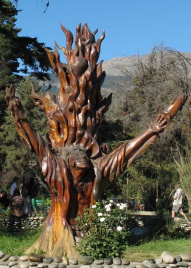 Statue de bois directement sculptée par des artistes locaux dans un arbre enraciné sur la Plaza Pagano.