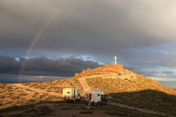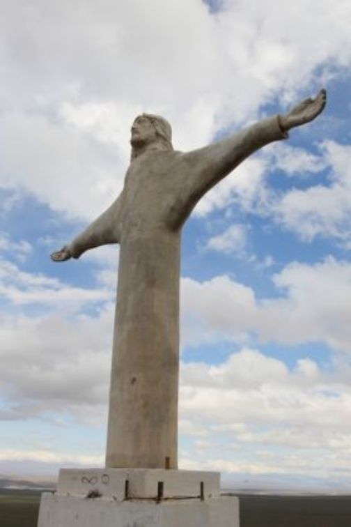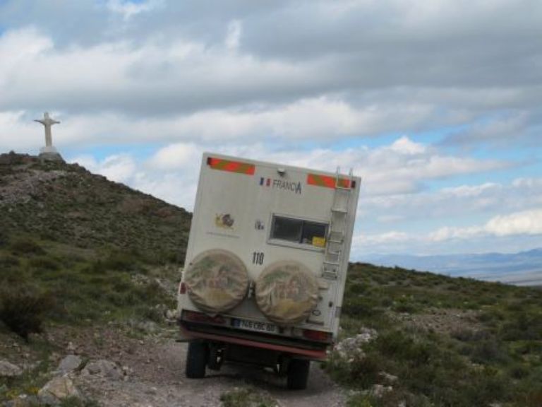 Nuit au grand calme, nous allons rester quelques jours avec la "Romney's family" cela va nous faire du bien d'avoir de la compagnie et d'oser passer par des pistes que nous ne ferions pas seuls. Il fait beau et nous partons vers le nord, arrêt courses et repas dans un petit village et nous continuons la piste qui n'offre guère de beaux spectacles car le temps est très couvert. Nous nous faisons un stop bivouac au pied d'une statut du Christ, énorme style Corcovado et pour ce faire nous suivons des traces qui vont me donner la trouille car le dévers est important.