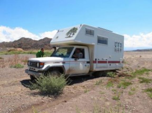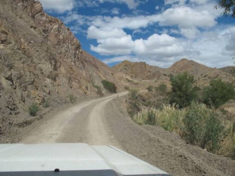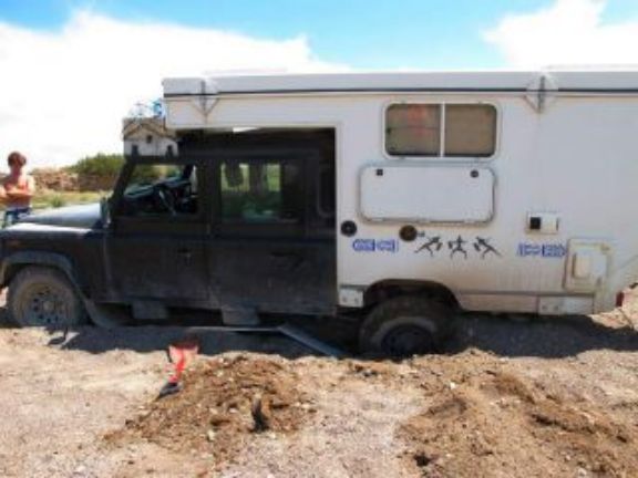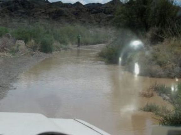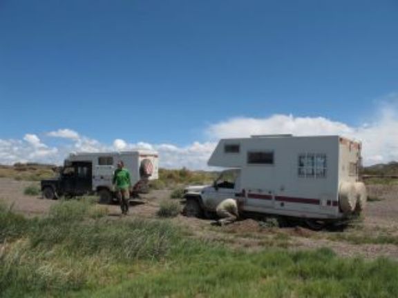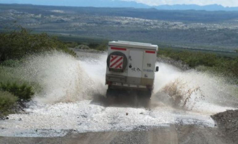 Gros orages toute la nuit, je crains pour l'état de la piste, nous verrons bien. Nous quittons notre emplacement de bivouac et nous passons sans aucune crainte. L'état de la piste empire très vite et il va falloir passer quelques gués fortement gonflés par les orages et la boue qui descend avec n'est pas là pour arranger les choses! La piste se transforme en torrent sur plusieurs centaines de mètres et il faut faire attention de ne pas y rester. Finalement nous parviendrons au village de Barreal où nous faisons quelques courses. Nous prendrons notre repas au restaurant et nous continuerons notre route jusque Rodeo, petite ville très connue par les amateurs de Kytesurf car il y a énormément de vent. Romney étant amateur nous nous dirigeons vers le lac par une piste qui n'en est pas une mais un chemin tracé par l'eau. Bien évidemment il y a de grosses flaques mais le piège viendra du sable très mou et surtout avec de la glaise en dessous. Premier ensablement pour moi, pas assez de vitesse, j'y reste et bien enfoncé. Nous passerons une heure pour placer les plaques à sable et heureusement Romney en a quatre paires plus les deux miennes cela devrait aller. Et bien non, ce sol avec de la glaise étant très mou je continue de m'enfoncer. Romney décide alors de me tirer car lui est passé. Ce qui devait arriver arrive, il s'ensable également. Nous avons nos deux véhicules assis sur le sable!!!!!