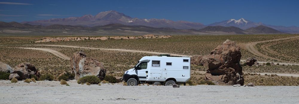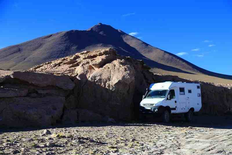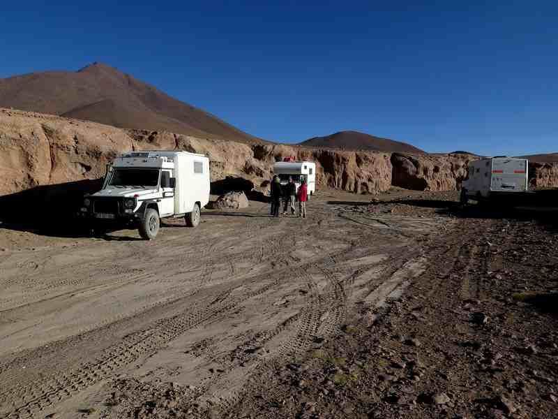 Mais avant nous avons le péage de la "Reserva Nacional de Fauna Andina Eduardo Avaroa", ouf et heureusement que nous avions fait du change à SPA. La Laguna Blanca nous apporte son lot de surprise par sa beauté mais aussi par un groupe de vigognes qui la traverse, c'est magnifique. Plus loin la fameuse Laguna Verde et resplendissante et nous en profitons pour déjeuner face à elle. Bon maintenant il faut monter jusque 5033 mètres sur 80 kilomètres pour faire l'entrée d'Hugo, il va nous falloir pas mal de temps car pas simple à trouver, des pistes partout et pas de pancarte, heureusement Osmand+ est là. On ne comprends pas pourquoi c'est comme cela, pourquoi faire simple, nous avons maintenant notre ticket d'entrée pour la Bolivie et nous nous dirigeons vers la Laguna Colorada où nous devons retrouver nos amis. La piste est très difficile mais les paysages sont grandioses, nul regret de ce côté et nous arrivons à la Laguna pour le bivouac du soir. Nous attendons Richard et Martine sur le bord de la piste et au loin nous voyons un véhicule blanc qui vient vers nous et fait un stop juste devant Hugo. Il s'agit d'un couple français en vadrouille en AmSud et du 51, des rémois aussi nous évoquons nos amis Co et Eric et il se trouve que René et Joëlle sont de très grands amis avec eux, que le monde est petit de se rencontrer sur une piste si loin de tout. Nous papotons un bon moment et voyons arriver nos autres amis, présentations et nous voici partis tous les six vers le bivouac du soir, belle aventure. Le seul hic c'est que je suis très malade avec l'altitude, je prends du Diamox depuis hier mais nous sommes montés de 3100 mètres dans la journée et cela ne pardonne pas, la nuit va être difficile.