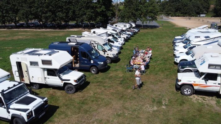 Nous sommes tous réunis maintenant en cette fin de journée dans un camping très sympathique. Nous sommes une quarantaine d'équipages et l'heure de l'apéritif arrive vite, nous commençons assez tôt, comme il se doit. Nos gentils organisateurs, Babette et Jean-Noël que nous connaissons depuis de nombreuses années sont aux petits soins pour nous tous et la soirée suivi du repas en commun sous un grand barnum va également être au top, c'est crevés mais contents que nous rejoindrons Hugo III vers 23h30.