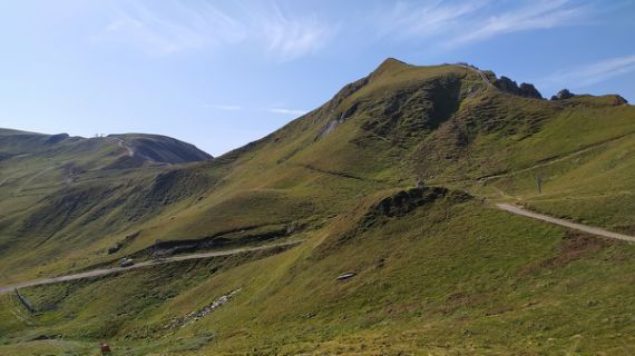 Ce matin départ tranquille vers le téléphérique du Mont Dore, c'est la grande foule et difficile de se trouver une place même sur les parkings payants. Nous quittons l'arrivée du téléphérique à 10h15 et traçons tout droit vers le col de La Cabane puis le col du Couhay. Il fait grand beau, la vue est parfaitement dégagée, c'est très beau. Nous revenons sur nos pas puis nous enchaînons vers le Pan de la Grange où nous faisons un pique-nique salvateur. Le retour à la station pour retrouver Hugo III sera pénible car nous devons prendre la piste de ski qui a été complètement refaite aussi nous glissons sur les pierres et nous nous tordons les pieds, nous n'aimons pas beaucoup.