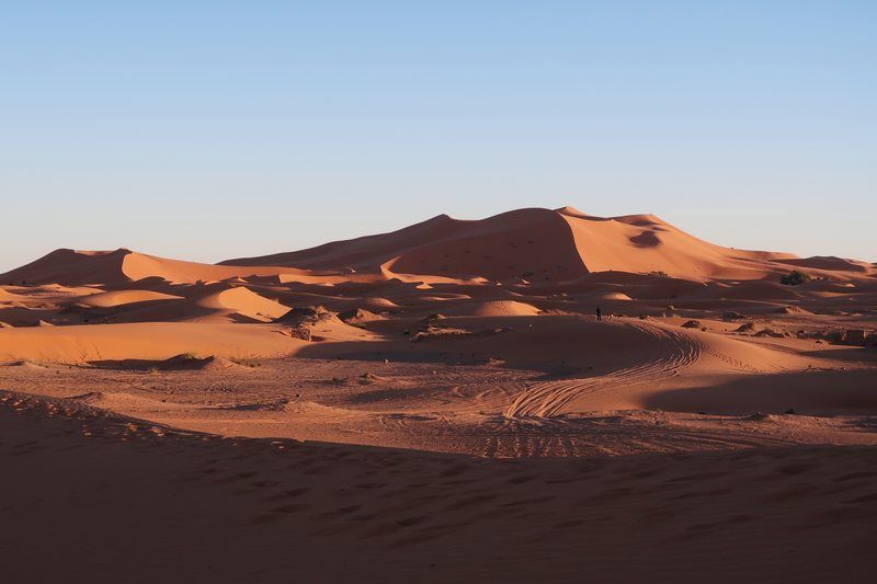 C'est parti jusque Merzouga, 0° ce matin mais grand soleil donc tout va bien. Nous allons nous poser chez Zaïd au Petit Prince où nous étions venus l'an dernier avec Babeth et Gérard, nos amis montagnards. Pas grand monde, faut dire que le parking est tout petit et cela nous convient très bien. En plus le restaurant est très agréable et les tagines succulentes, nous y dinerons ce soir. Une fois installés, nous partons nous balader vers les dunes, seuls, c'est très agréable, nous profitons des belles couleurs de la soirée.