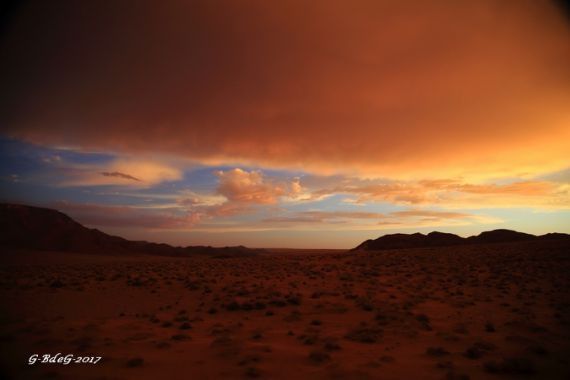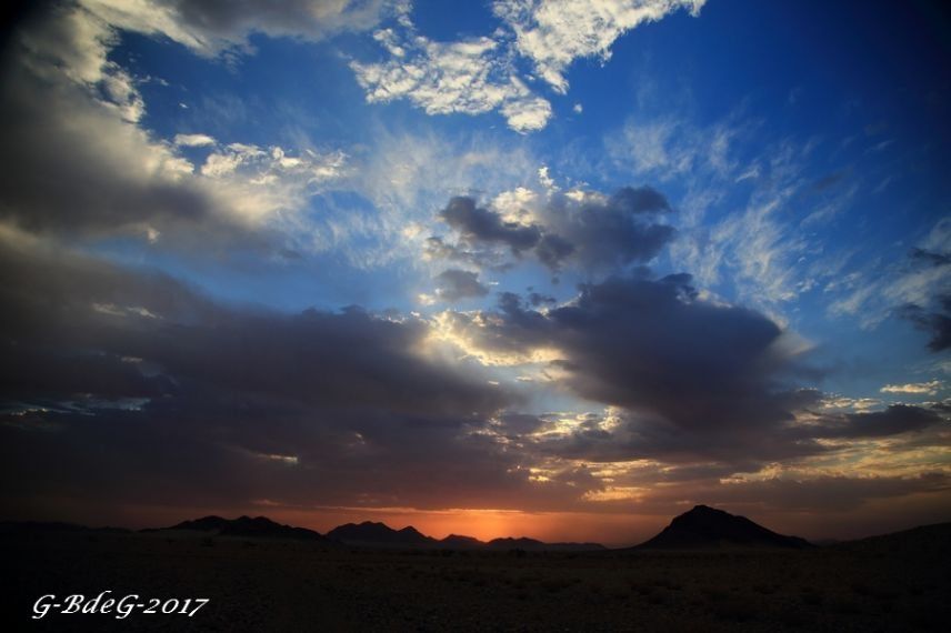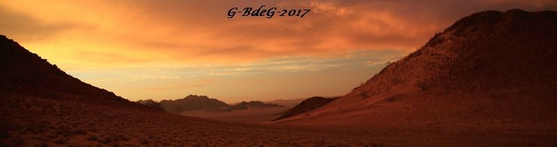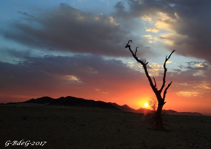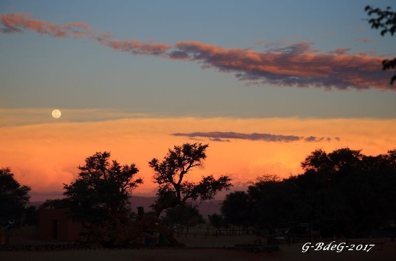 Fin de journée toujours devant le soleil qui vient nous dire bonsoir, que c'est magique la Namibie.