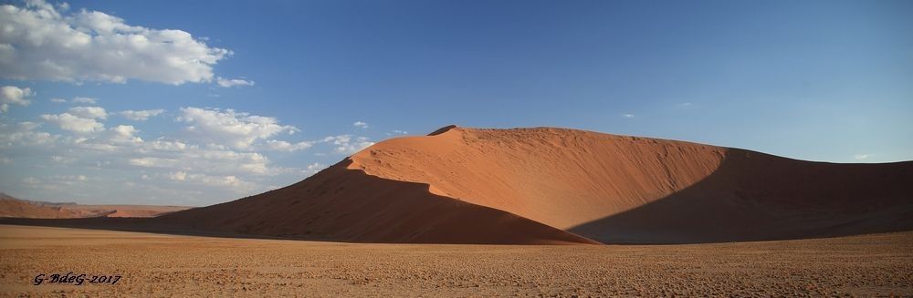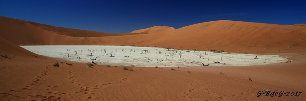 Pour notre part et compte tenu des pneus savonnettes, nous prenons un 4x4 du parc qui pour 170$NA soit environ 10€ nous conduit au bout sans nous prendre la tête. Nous ferons à pied les 1.100km pour nous rendre au vlei et au pan, le soleil chauffe dur, le sable est mou mais arrivés au bout la vue est tout de même superbe.