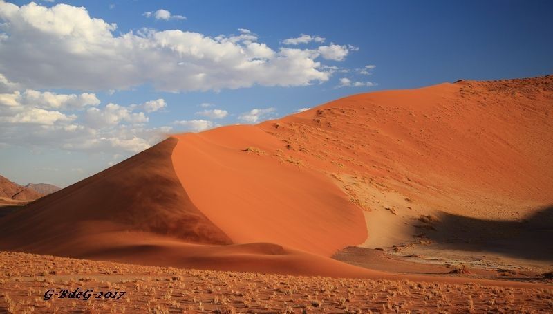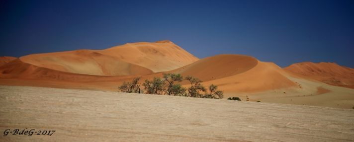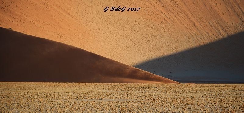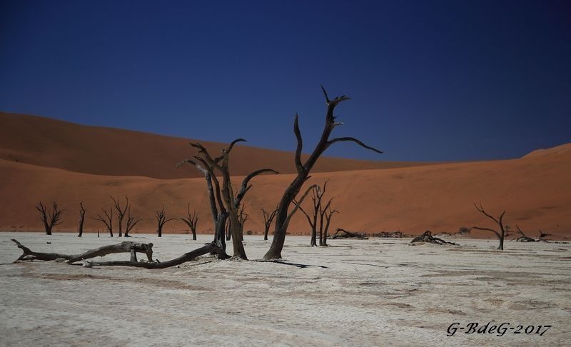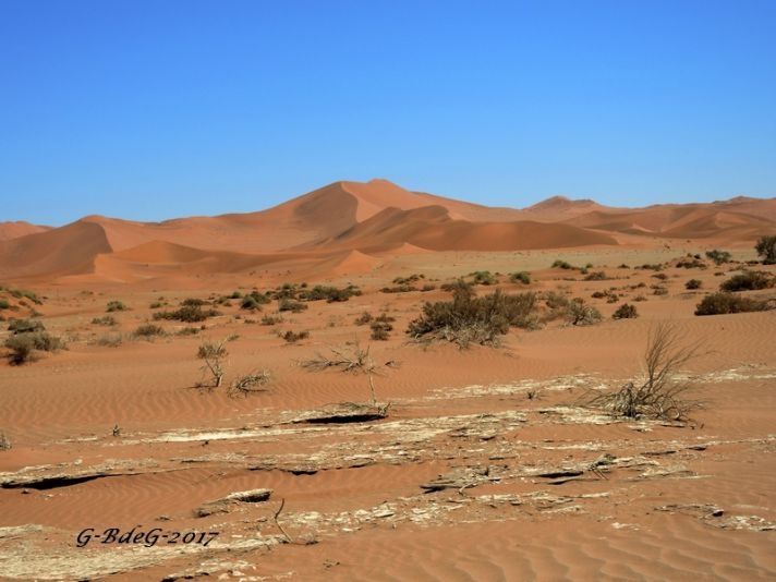 Sommes levés avec le soleil, les dunes se teintent de différentes couleurs, les 4x4 partent à Sosusvlei pour admirer le lever, enfin pour voir l'éclairage changer progressivement. Pour notre part nous voulons aller sur Deadvlei que nous n'avions pas vu en 2001 et qui reste un des lieux à faire ici. Il ya 70km et surprise l'ancienne piste est goudronnée jusqu'au bout. Seuls les deux derniers kilomètres restent à faire en "vrai 4x4". Nombreux sont ceux qui vont s'ensabler et devoir attendre d'être dépannés sur cette dernière partie.