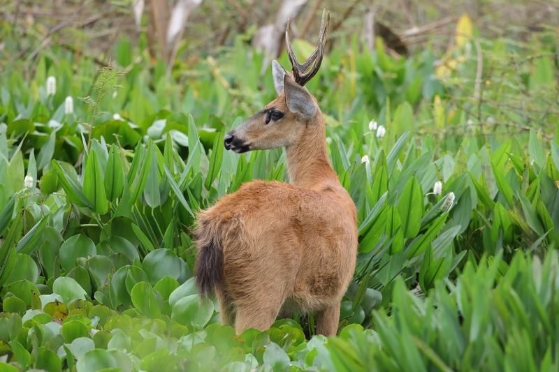 Nous allons, en début d'après midi, nous installer autour d'un petit étang jusqu'à la tombée de la nuit, les visites ne seront pas nombreuses, un tamanoir, un jeune cerf du Pantanal, un coati et quelques oiseaux très loin pour les shooter, demain sera meilleur.