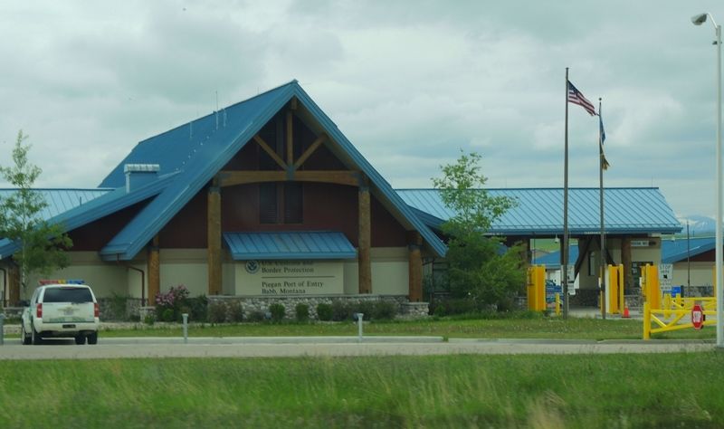 Nous passons vite la douane en ayant pris soin de finir les fruits et légumes frais ainsi que la viande fraîche dans un rapide repas. Nous passons la douane des USA à Piegan, somme reçus en premier au poste d'entrée par une gentille demoiselle douanière qui prend nos passeports nous pose quelques questions d'usages, pas d'armes à feu, pas d'alcool, etc, et nous demande d'aller nous garer sur la parking et de revenir au bureau derrière pour finir les formalités. Nous avons à faire à une autre douanière avec un beau sourire, prises de nos empreintes (les deux mains), vérification au computer avec celles fournies en France à l'Ambassade des USA, nous devons payer 6$ chacun pour le travail et nous prenons la route, nous sommes au Montana.