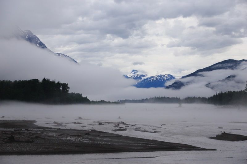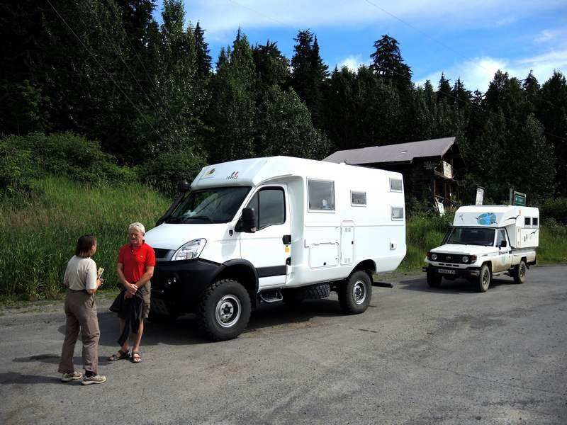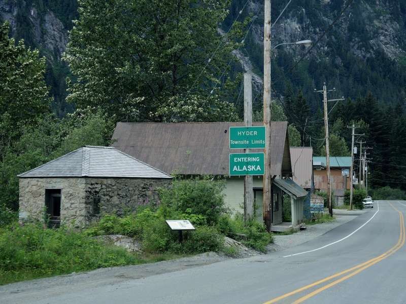 En route à 8h30 vers une destination que nous attendons depuis un moment, Hyder, après être passé à Stewart où nous dormirons ce soir. Au passage nous faisons un stop à Gitanyow pour y voir quelques beaux totems puis nous retrouvons vite la H37 en direction du grand nord. La route est vraiment intéressante mais pas de faune ce qui nous manque. Au carrefour de la H37 et la H37A nous voyons arriver un Toyota 79 avec une cellule que je reconnais tout de suite, nous stoppons et le Toyota aussi, il s'agit de François Drioux avec qui je suis en contact sur Voyages Forum depuis quelques années et nous nous étions parlé au téléphone en 2008. Quelle surprise et encore une fois nous pouvons dire que le monde est petit, nous parlerons un bon moment et nous devrions nous retrouver ce soir sur Stewart. En attendant nous allons faire les 78 km qui nous restent en ayant les yeux qui roulent de partout sur les montagnes, nous sommes entourés de glaciers, c'est magnifique sauf que le temps lui n'est pas des plus beaux, côte Pacifique oblige!