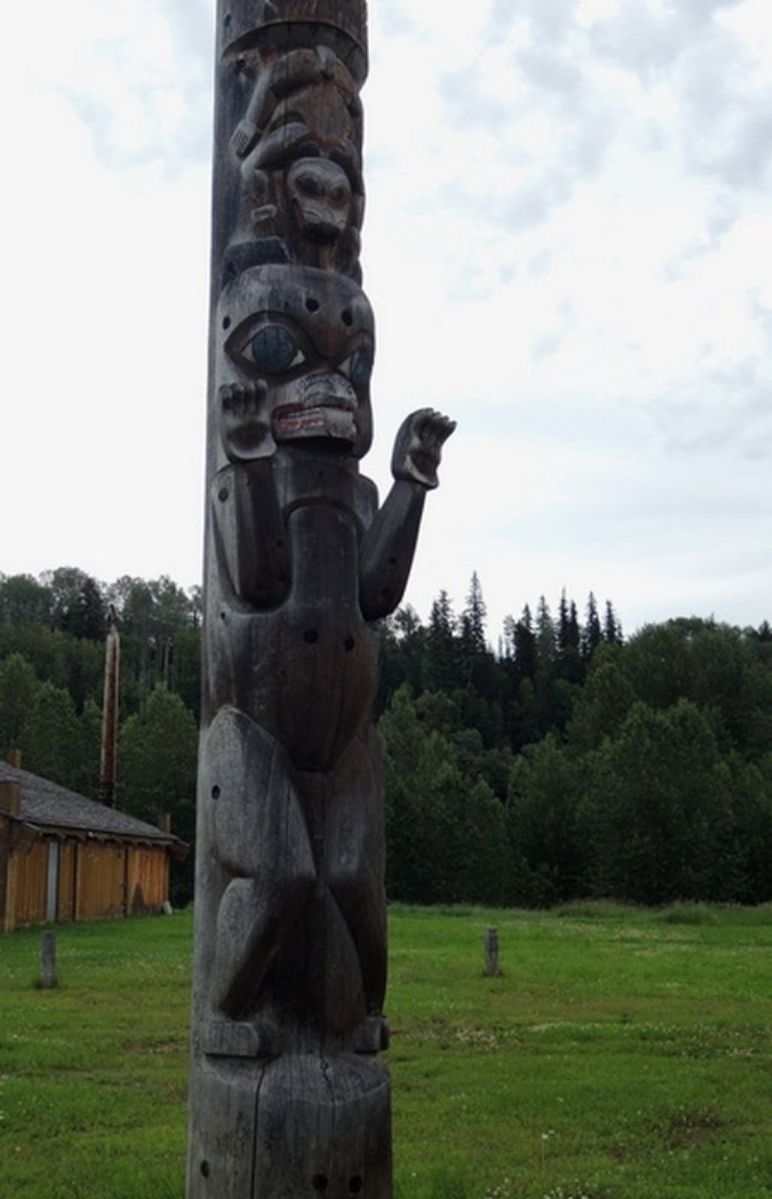 Nous restons sur Hazelton pour la journée et nous devrions reprendre la route demain pour aller sur Hyder en Alaska. Ce matin nous partons faire la visite de villages indiens où nous pourrons voir de très beaux spécimens de Totems. Nous longeons également la vallée de la Skeena qui est très large ici et qui possède de beaux saumons. Au retour nous faisons un stop au musée qui est à proximité du camping puis comme il fait chaud, nous rentrons déjeuner dehors s'il vous plaît, c'est notre premier repas en extérieur depuis notre arrivée.