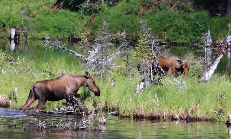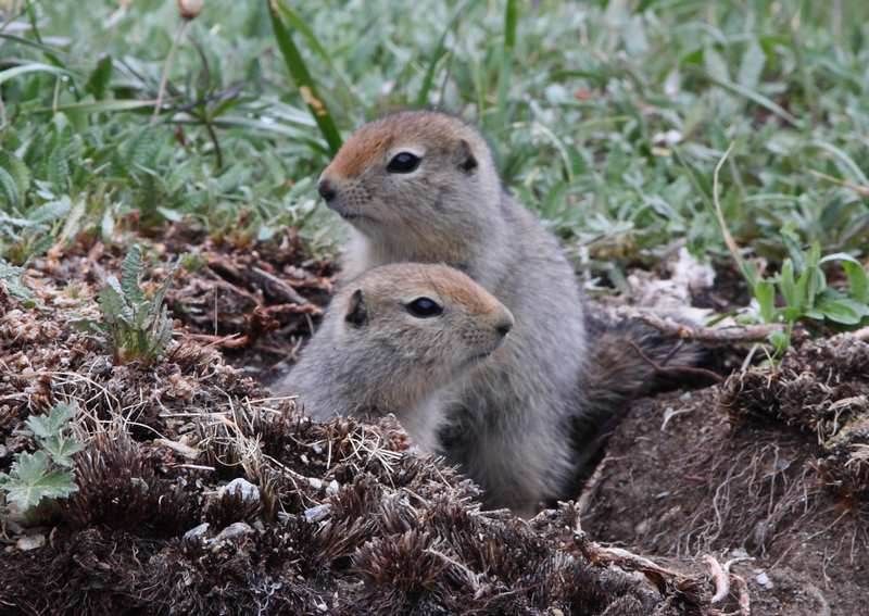 Waooh quelle belle nuit nous avons faite et ce matin c'est le sourire sur nos visages, il fait un temps superbe que rien ne laissait présager aussi nous ne tardons pas pour pouvoir en profiter au maximum. Le manque de soleil depuis quelques jour nous a rendu un peu sombre et là tout à coup c'est le bonheur de pouvoir enfin profiter des paysages qui s'offrent à nous. Nous allons être gâtés car nous avons la vue sur les glaciers que nous ne pouvions voir hier et surtout nous sommes face au Mont McKinley qui est superbe dans son manteau blanc. Nous n'en ratons pas une miette et faisons de multiples stops si bien qu'il va nous falloir deux heures pour clore les 45 km qu'il nous reste à faire sur la Denali Higway. Arrivé au carrefour de Cantwel nous remontons au nord vers Denali National Park. En chemin nous ferons de nouveaux stops pour mitrailler des élans dans un lac et nous filons direct au visitor center afin de savoir s'il y a des places pour les campgrounds du parc. Tout est saturé aussi nous partons sur Savage River, terminus pour les véhicules qui n'ont pas le droit d'entrer sur le parc sauf jusque Teklanika pour ceux qui ont un permis pour le camping. Nous déjeunons sur le parking puis partons faire une rando avec tout le matériel photo car nous avions vu des "mouflons de Dale" en 2008 sur un site que nous avait donné notre ami Fabrice Simon. Nous n'en verrons pas, dommage, certainement trop tôt en saison mais nous allons nous régaler avec les spermophiles, sorte de petits écureuils. De retour chez Hugo après une balade de trois heures, nous reprenons le chemin de l'entrée et nous avons la chance de voir un caribou. Il se fait tard aussi nous allons reprendre la route en direction d'Anchorage pour nous trouver un endroit où passer la nuit, après deux heures de route nous faisons un stop au Bayers Lake et trouvons un state campground où nous serons très bien pour nous reposer et reprendre des forces car demain sera encore une belle journée nous l'espérons. Avant de nous coucher nous partons faire une balade autour du lac qui est super beau, nous faisons quelques photos puis rentrons nous coucher, il fait un grand soleil à 22h00!