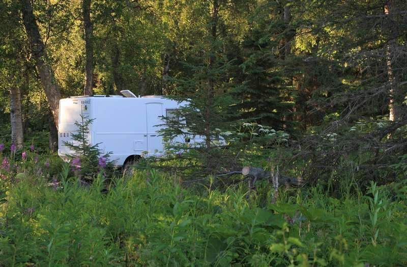 Quelle nuit, quasi impossible de dormir car vers 1h30 du matin nous avons le droit à des coups de feu, on tire quelque part pas très loin de nous. Une voiture passe à ce moment là et une rafale se laisse entendre, cela va durer jusque vers 3h00 du matin et entre temps je me suis levé cinq ou six fois pour essayer de comprendre, dehors il fait presque jour mais je ne vois rien mis à part deux piétons qui passent devant Hugo, alors s'agit-il de fêtards qui s'amusent à tirer ou bien autre chose, nous ne le saurons jamais. La tête un peu enfarinée, nous quittons notre emplacement assez tôt et partons faire quelques courses sur Soldotna avant de prendre la route qui nous conduira vers Homer, mais avant nous nous enfilons sur une petite piste qui va me conduire au bord de la Swanson River et où je vais pouvoir pêcher pendant deux heures, que c'est bon!