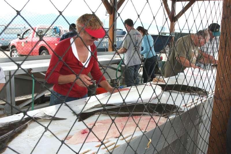 Ce sont les pies qui nous réveillent ce matin, il est 8h00, pas vraiment l'heure de partir pêcher, nous avons fait une super nuit et au calme, pas de coup de feu pour nous maintenir éveillés, c'est parfait. Il fait moins beau que les autres jours, quelques nuages blancs qui font un voile sur l'océan mais cela ira bien, nous préférons cela à la pluie. Nous partons sur Homer où nous passerons la journée et nous y retrouvons Sylvie et Christian avec qui nous déjeunerons dans un des nombreux restaurants, enfin endroits où il est possible de grignoter du halibut, poisson pêché ici. Il fait très frais, un vent glacé entre depuis l'océan et nous devons nous couvrir un peu plus chaudement. Nous faisons une grande promenade sur le Split, bande de terre qui permet d'abriter le port saturé par les nombreux bateaux des pêcheurs locaux. Nous assistons au prélèvement des filets de poisson ramenés par les pêcheurs, des mains expertes après des années de pratique, il ne faut pas plus de cinq minutes pour découper un poisson de un mètre de long! Nous rentrons au même endroit qu'hier où nous sommes si bien et je retourne pêcher jusqu’à 20h00, que du plaisir et les prises un peu petites retourneront à l'eau. C'est très fatigués par cette journée au grand air que nous nous couchons, demain sera encore un autre jour et nous avons décidé de rester ici au moins une journée de plus pour nous détendre et profiter de la pêche et des oiseaux, que du bonheur une fois de plus.
