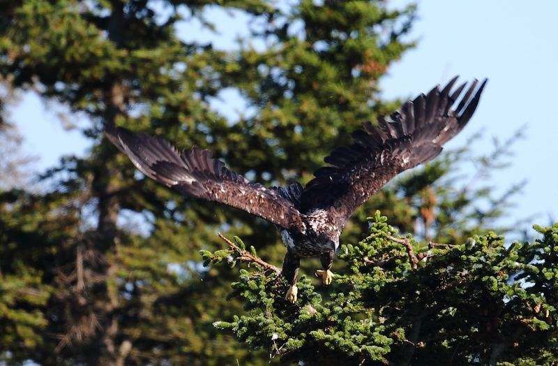 Nous allons bidouiller presque toute la journée, cela fait du bien et vers 17h30 nous partons tous les quatre vers la plage où se trouvent les aigles. Nous sommes vite en position devant un juvénile qui va nous offrir un super spectacle durant près de 1h30. Un adulte se présente au sommet d'un sapin et nous partons donc le retrouver. Il va se laisser photographier juste au moment de notre arrivée au pied de son arbre, par contre celui-ci ne sera pas coopératif mais je le mitraille en rafale et le résultat sera correct.